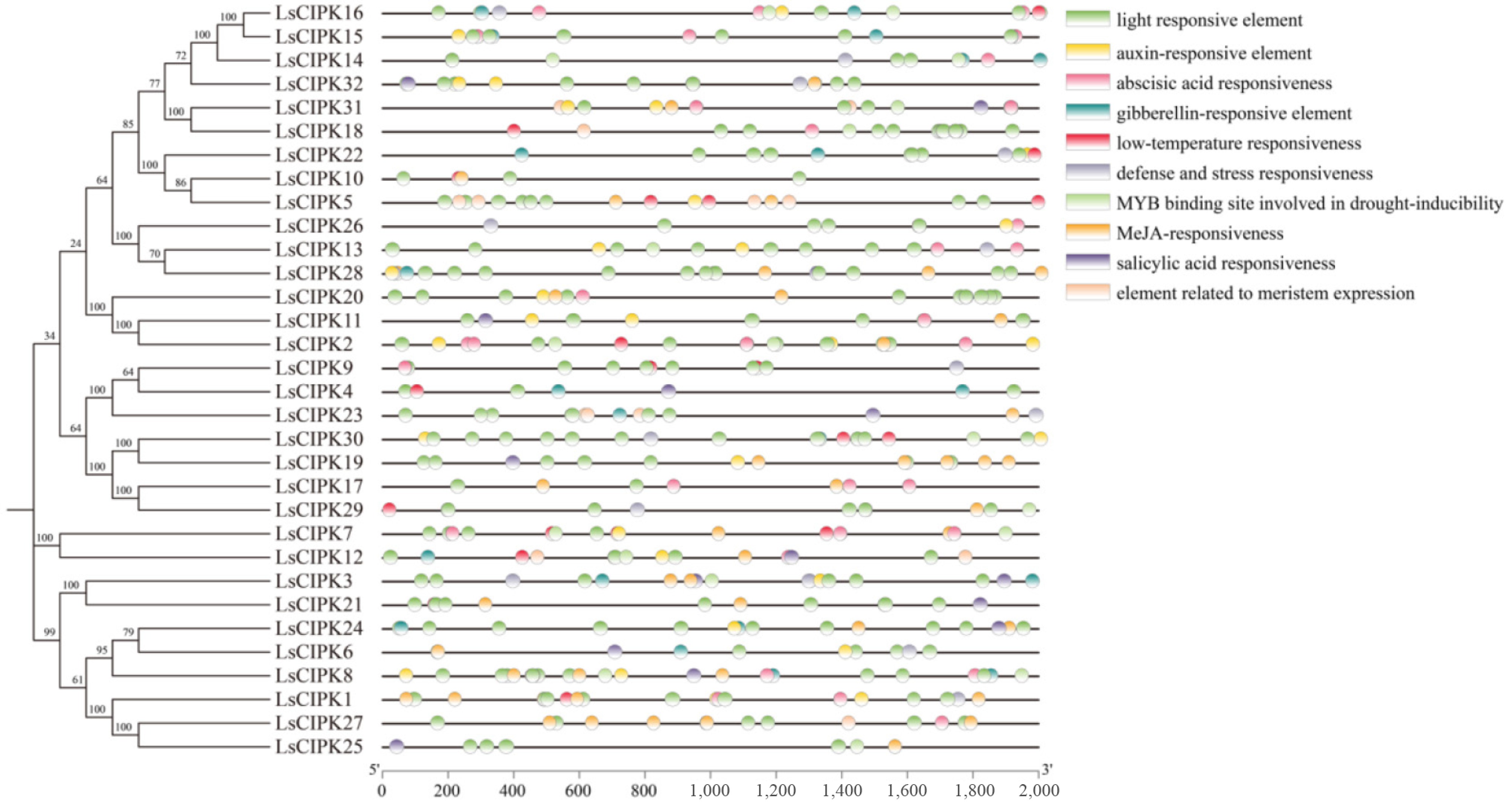 Analysis of cis-acting elements associated with specific plant hormones and abiotic stresses within 2,000 bp upstream of the LsCIPKs sequence.