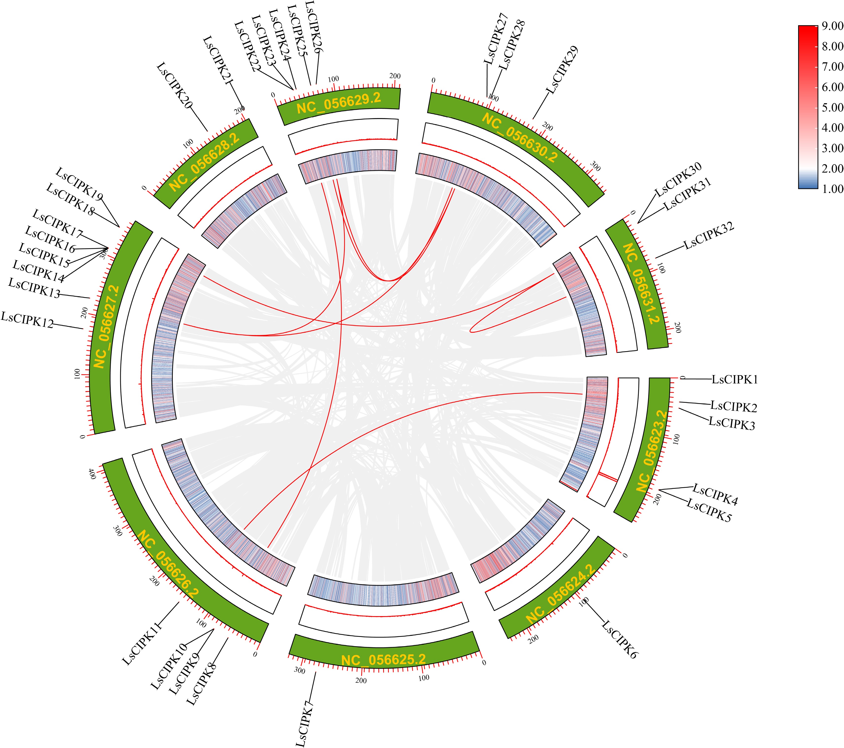 Genome-wide colinearity analysis of the lettuce CIPK gene family. Arcs of different colors represent homologous gene pairs between chromosomes; the green outer ring depicts the nine chromosomes of lettuce (LsChr1–LsChr9). The heatmap colors (blue, red) indicate a gradient of sequence similarity (from low to high).