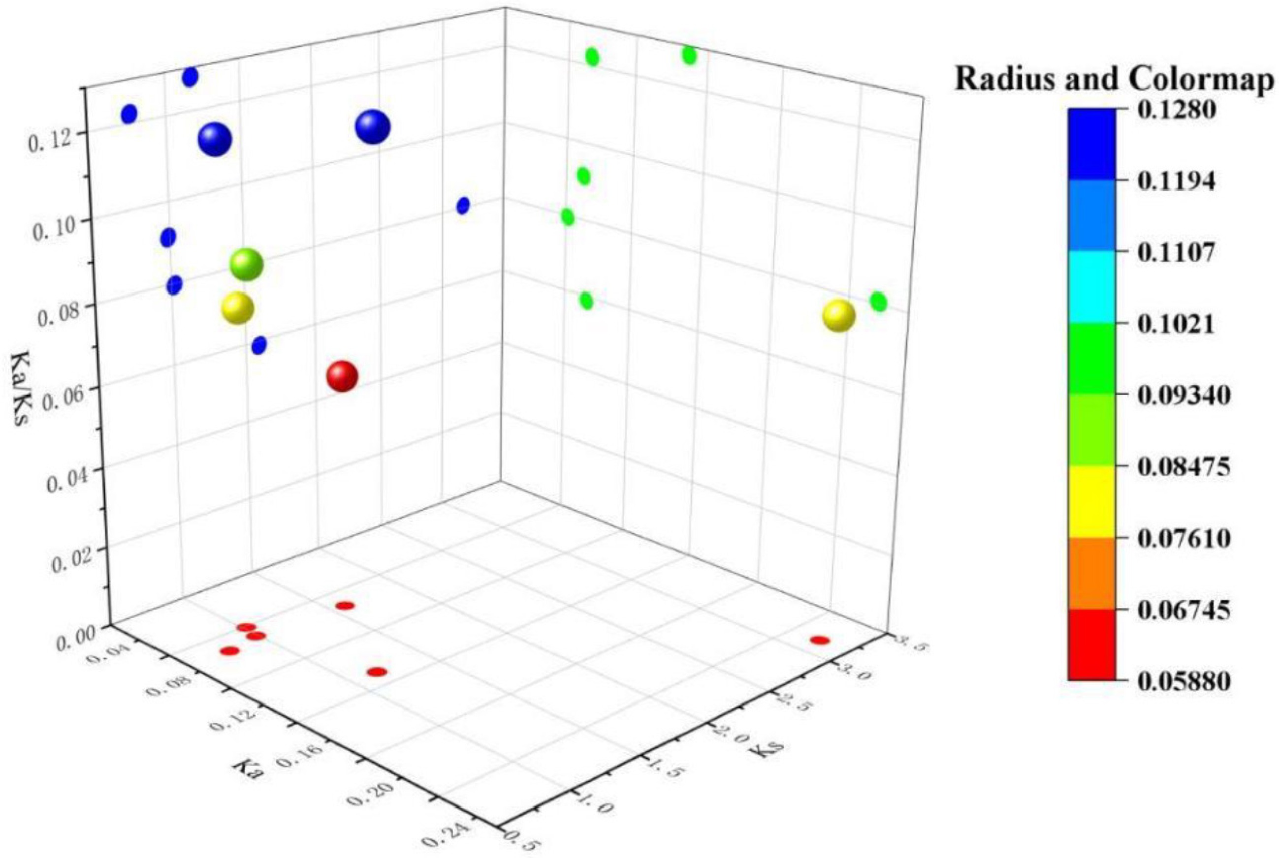 Analysis of Ka/Ks ratios for collinear genes in the lettuce CIPK gene family. The bubble chart displays the distribution of Ka, Ks, and Ka/Ks values for each gene pair, with color and bubble size indicating the range of Ka/Ks ratios.