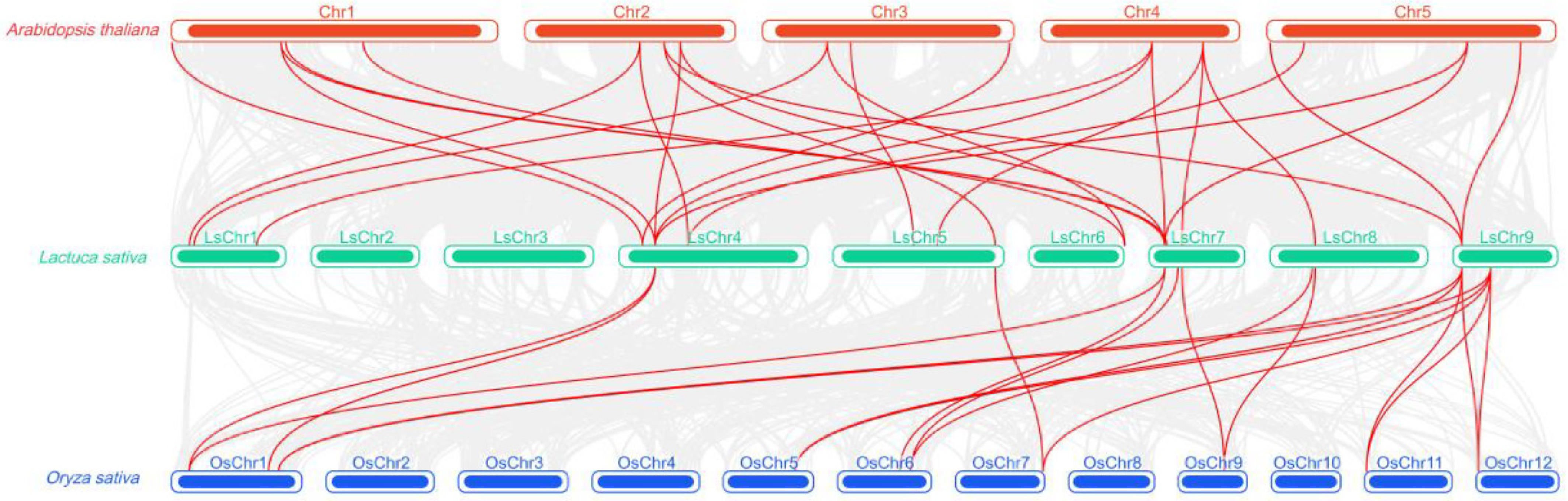 Cross-species orthology analysis of the CIPK gene families in lettuce, Arabidopsis, and rice. Red lines indicate homologous gene pairs between different species; the top panel shows Arabidopsis chromosomes (red), the middle panel shows lettuce chromosomes (green), and the bottom panel shows rice chromosomes (blue); the density of lines reflects the degree of colinearity among CIPK genes across different species.