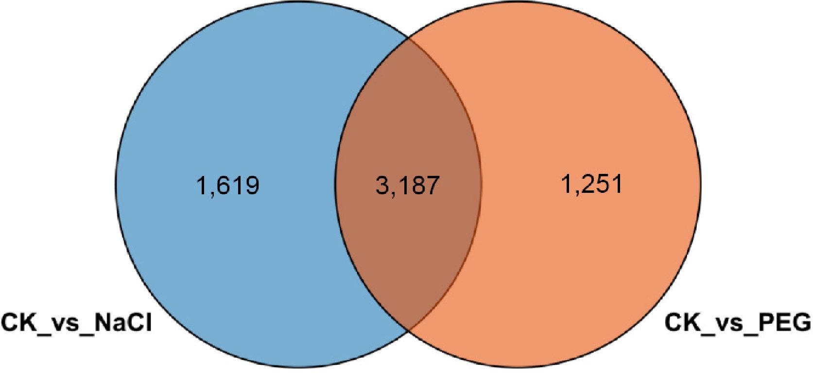 • To compare the transcriptional responses of lettuce under salt stress vs drought stress conditions, differential expression gene (DEG) analysis was performed on the NaCl-treated group (CK vs NaCl) and the PEG-treated group (CK vs PEG), respectively. Based on the normalized expression matrix, DESeq2 was employed for differential expression analysis. The screening threshold was set to |log2FC| ≥ 1 and FDR < 0.05. The DEGs obtained under the two treatment conditions were imported into TBtools (v1.098) separately. The Venn Diagram module was used to perform intersection analysis, identifying co-differentially expressed genes (co-DEGs) involved in both salt and drought responses, as well as genes specific to each treatment. The final intersection statistics and Venn diagram visualization were automatically generated by TBtools.