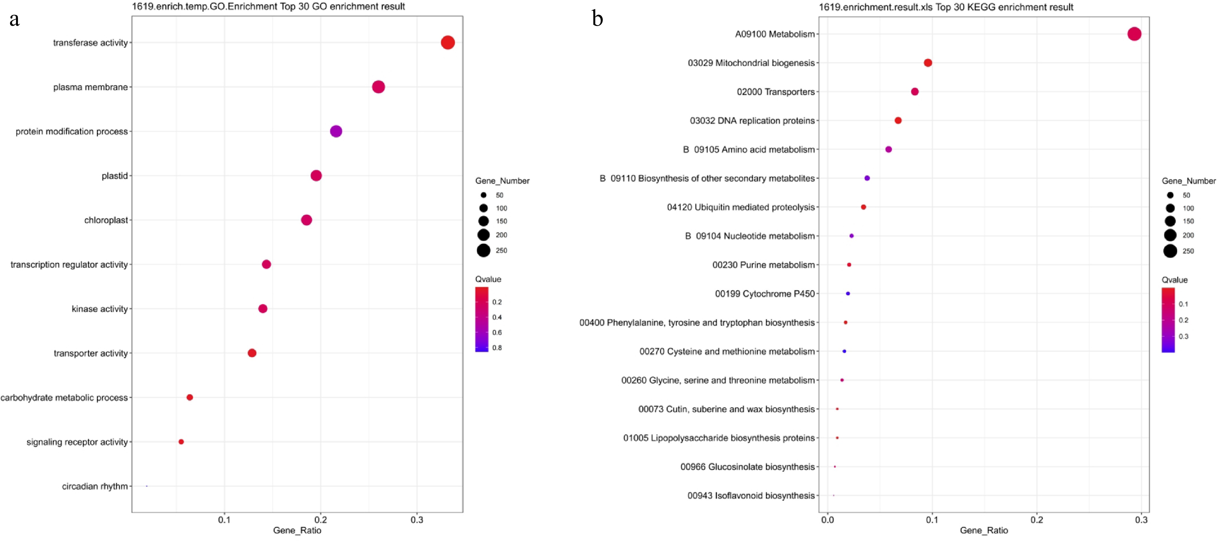 • To analyze the functional characteristics of genes specifically responding to salt stress, GO and KEGG enrichment analyses were performed on 1,619 genes differentially expressed in response to NaCl treatment (Fig. 9). GO analysis revealed that these genes were primarily enriched in entries related to transferase activity, kinase activity, transcriptional regulation activity, protein modification processes, plasma membrane, and chloroplast-associated functions (Fig. 9a). This indicated that salt stress significantly impacted signal transduction, membrane structural homeostasis, and photosynthetic organ function. KEGG analysis further revealed that the specific DEGs were significantly enriched in multiple metabolism-related pathways, including metabolic pathways, mitochondrial biogenesis, transport proteins, DNA replication proteins, and amino acid metabolism (Fig. 9b). Additionally, the enrichment of pathways such as ubiquitin-mediated protein degradation and P450 redox reactions indicated that salt stress might also participate in the response by regulating protein turnover and redox balance. In summary, genes specifically responsive to salt stress primarily participate in processes such as signal perception, transmembrane transport, energy and nitrogen-carbon metabolism, protein processing, and redox regulation.