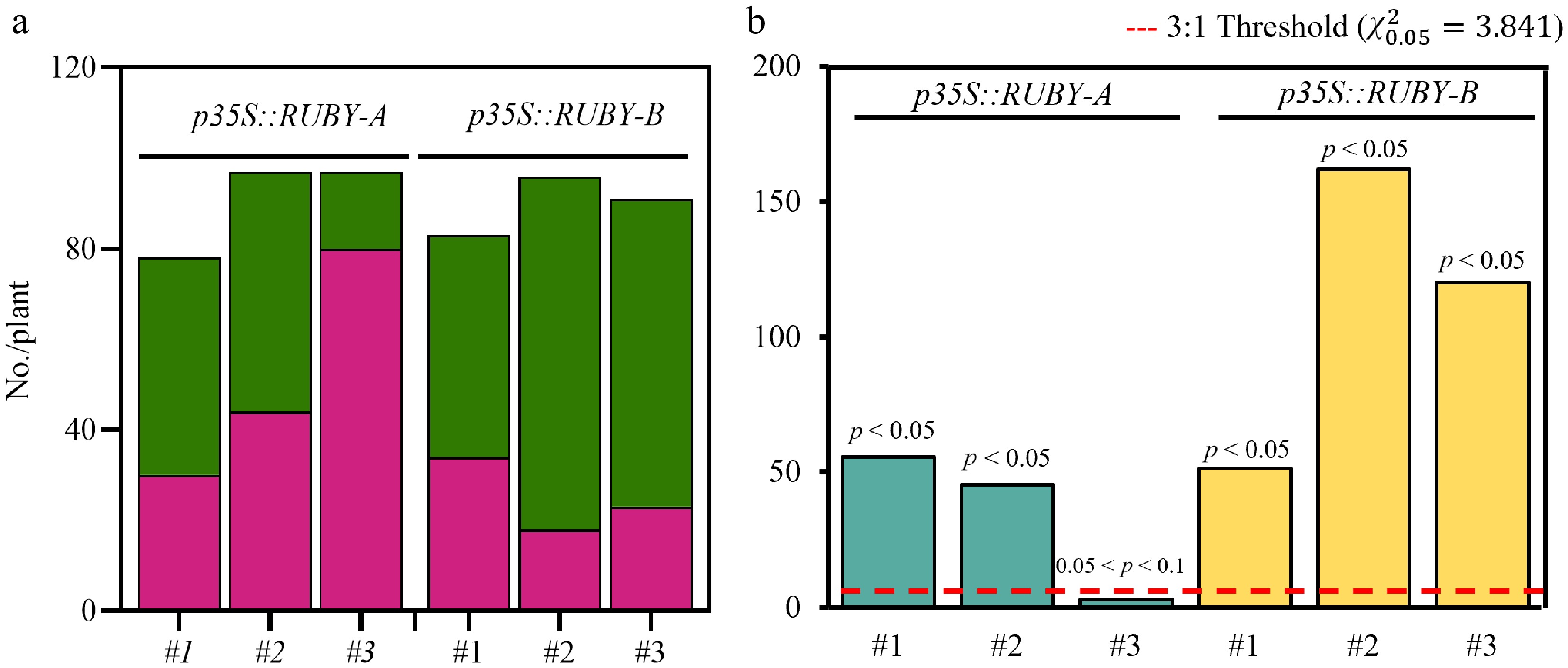 Early and accurate identification of single-copy transgenic lines is critical for subsequent genetic analyses and phenotypic evaluation. Given the stable and visually distinct expression of RUBY at the seedling stage, we assessed its utility for single-copy transgene screening. T1 seedlings of Arabidopsis lines carrying p35S::RUBY-A or p35S::RUBY-B were analyzed, and could be directly distinguished on the basis of red versus green coloration. For example, seedlings of the p35S::RUBY-A#3 line segregated approximately 3:1 for red versus green (Fig. 2a), consistent with single-copy Mendelian inheritance (χ2 test, p > 0.05) (Fig. 2b). These findings demonstrate that RUBY provides a rapid, intuitive, and instrument-free strategy for efficiently identifying single-copy transgenic lines at the seedling stage, offering a reliable tool for transgene screening in plants.