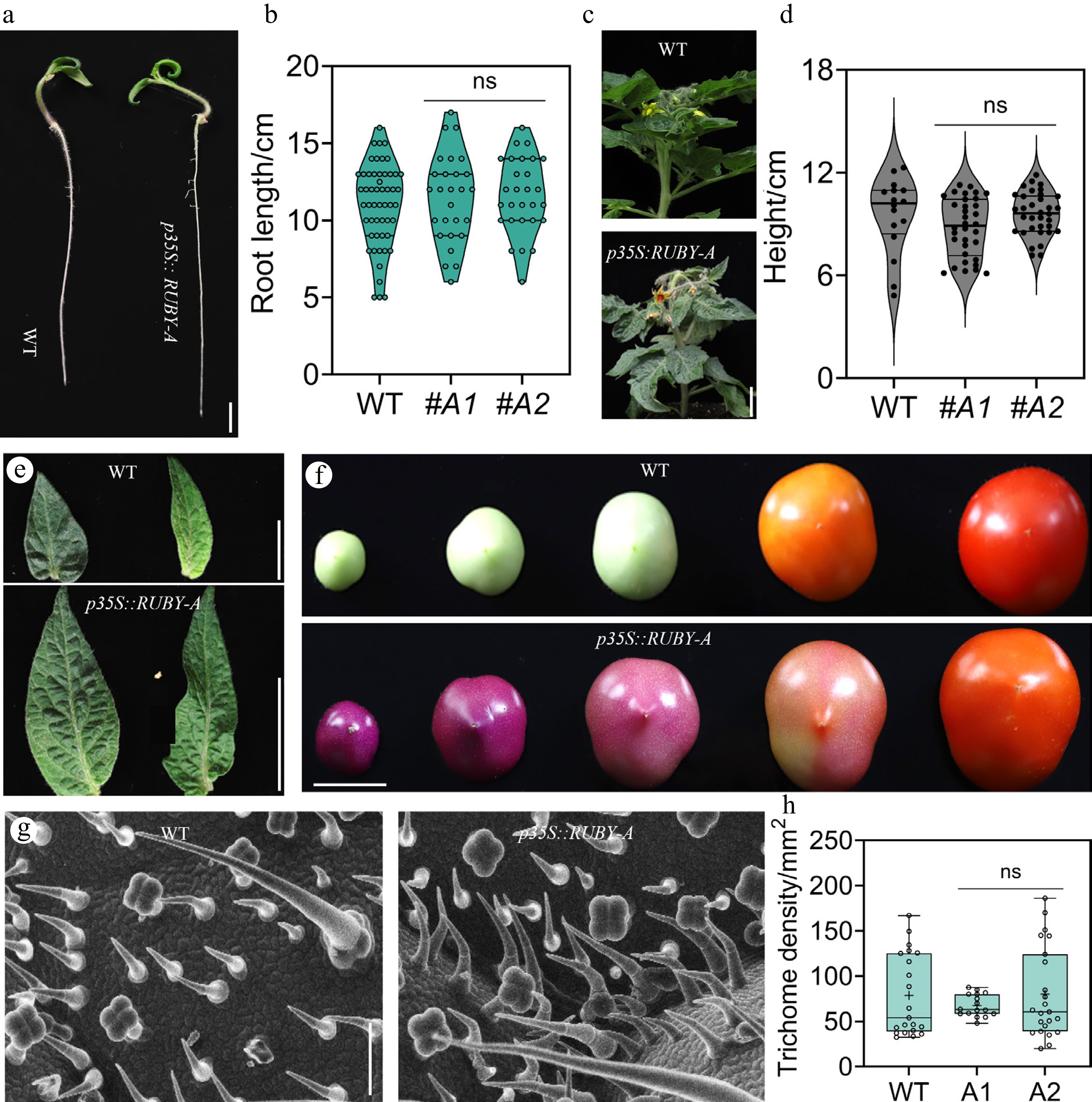 Plants' development and epidermal differentiation with the RUBY system. (a), (b) Phenotypic observation and quantification of wild-type (WT) and p35S::RUBY plants, scale bar = 1 cm. (c), (d) Observation and quantification of plant height in WT and p35S::RUBY plants, scale bar = 1 cm. (e) Analysis of leaf morphology in WT and p35S::RUBY plants, scale bar = 1 cm. (f) Analysis of fruit morphology and size in WT and p35S::RUBY plants, scale bar = 1 cm. (g), (h) Observation and quantification of trichome morphology in WT and p35S::RUBY plants, scale bar = 1 mm.