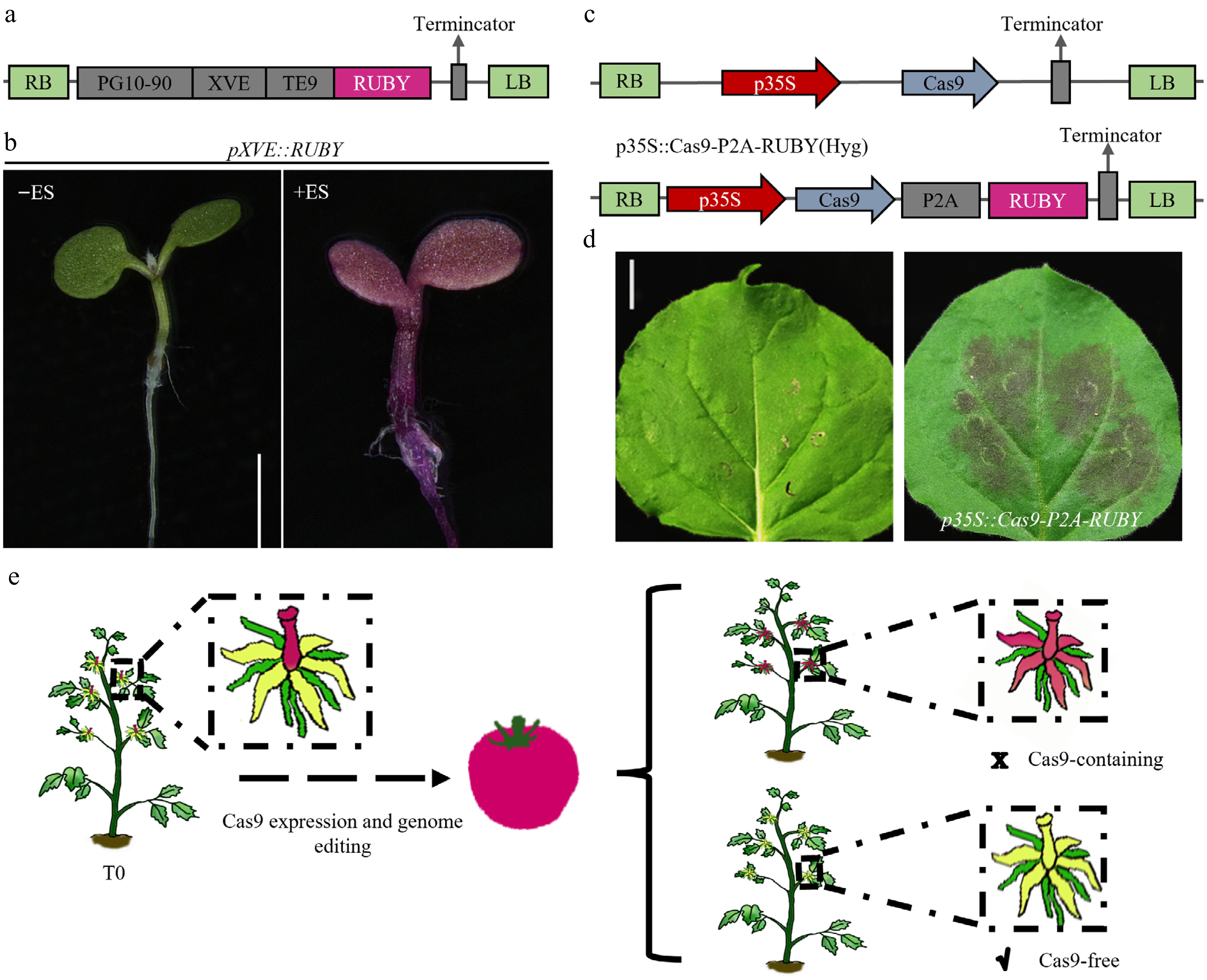 Existing reporters, such as fluorescent proteins and β-glucuronidase (GUS), require specialized equipment, show restricted expression, or can affect plant growth[17−22]. The 2A-linked unit of CYP76AD1, DODA, and Glucosyltransferase (RUBY) system, a natural pigment-based reporter visible as red coloration without instruments, offers a promising alternative[23−33]. However, its cross-species applicability, dependence on the vector backbone, and potential for synchronized monitoring of genome editing events remain unexplored. In this study, we constructed and optimized a RUBY-based visual platform, assessed the effects of the vector backbone on the stability of expression, and demonstrated its robust performance in Arabidopsis thaliana, tobacco (Nicotiana tabacum), and tomato (Solanum lycopersicum). We also developed inducible and CRISPR-associated protein 9 (Cas9)-porcine teschovirus-1 2A peptide (P2A)-RUBY modules for temporal monitoring and real-time visualization of editing events[34], providing a versatile solution for stable transgene screening and genome editing workflows.