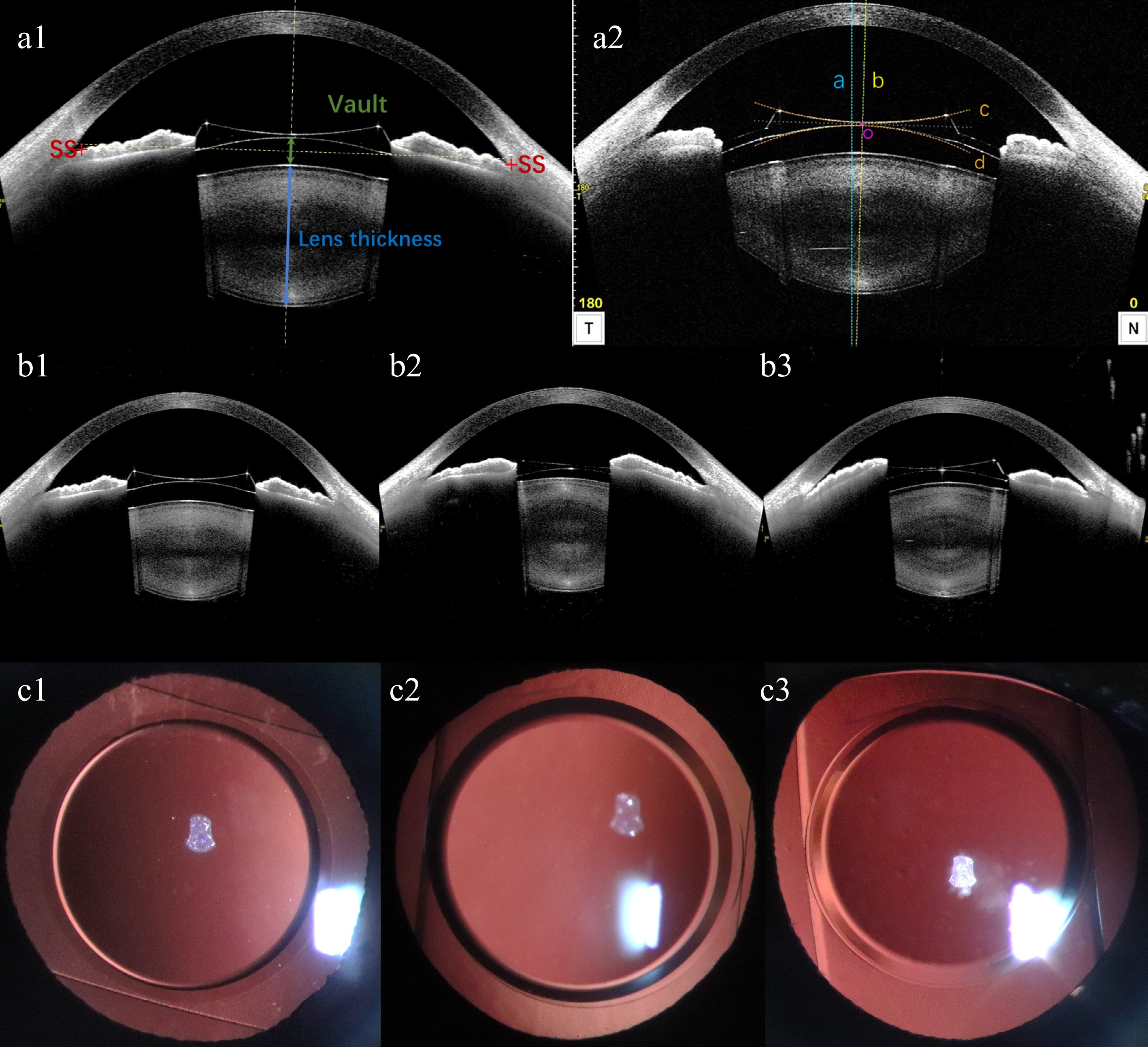 (a1), (a2) Schematic diagram of anterior segment parameters from CASIA2. (a1) Vault, postoperative ACD, ACW, and lens thickness measured by CASIA2. SS: scleral spur. ACW: anterior chamber width, the distance between the bilateral scleral spurs. Postoperative ACD: postoperative anterior chamber depth, distance from corneal endothelium to anterior surface of EPRL. Vault: green line with double arrowheads, distance from the back surface of EPRL to the front surface of natural crystalline lens. Lens thickness: blue line with double arrowheads, natural crystalline lens thickness. (a2) A representative image showing the location of EPRL in the eye from the manually corrected Lens Analysis mode of CASIA2. The horizontal and vertical decentration and tilt were the values on the 0- and the 90- degree-images. The blue dashed line (line a) represents the visual axis passing through the corneal vertex. The yellow dashed line (line b) represents the central axis of EPRL, which passing through the centers of the two circles formed by the manually corrected front surface line (line c) and back surface line (line d) of EPRL. The midpoint of the intersections between the central axis and the front and back surfaces of EPRL is the center point of EPRL (point o). The decentration of the EPRL is quantified by calculating the vertical distance between point o and the visual axis. The tilt of the EPRL were quantified by calculating the rotation degree between line a and b. (b1)−(b3) EPRL and iris morphology observed by CASIA2. (b1) EPRL is relatively centered, with bilateral iris symmetry. (b2) EPRL decenters to the right, with a higher position of the iris on the right side compared to the left. (b3) EPRL decenters to the left, with the iris on the left side positioned higher than the right. (c1)−(c3) Anterior segment photography with the slit lamp backlighting method was used to capture the position of EPRL rotation.