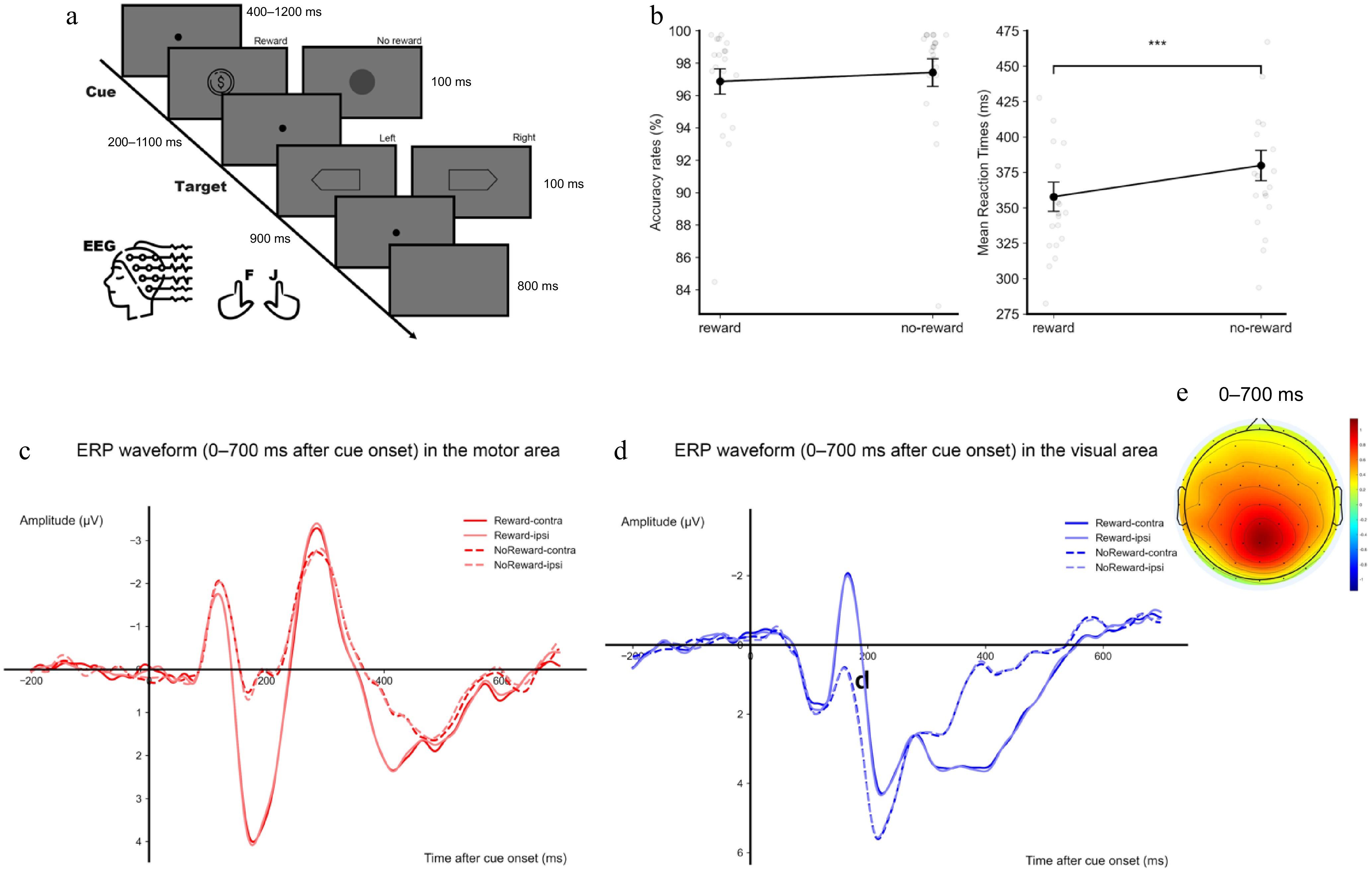 (a) Illustration of the experimental design and an example of a trial sequence. The reward cue was shown as the 1-Yuan coin, while the no-reward cue was shown as the round mask. Participants had to judge the head direction of the target hexagon. (b) Mean accuracies (left) and reaction times (RT, right) are shown as a function of reward. (c) ERP waveforms within 0–700 ms after the cue onset over the motor area. (d) ERP waveforms within 0–700 ms after the cue onset over the visual area. The four conditions are reward-contralateral, reward-ipsilateral, no-reward-contralateral, and no-reward-ipsilateral. (e) The topographical distribution of amplitude difference between reward and no-reward conditions within 0–700 ms after the cue onset. Error bars represent ± 1 s.e.m. calculated across participants (n = 20). ** p < 0.01, *** p < 0.001.