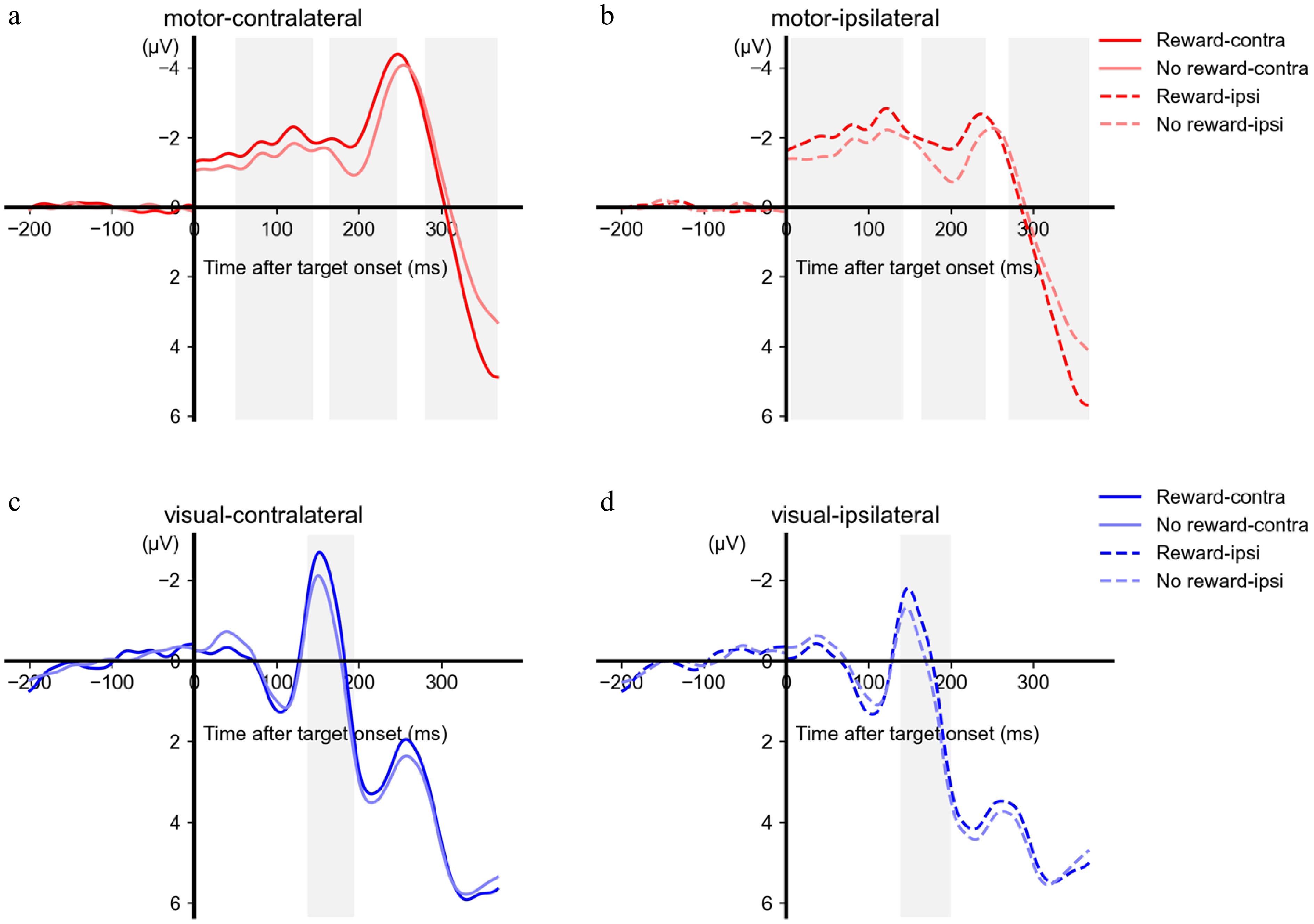 ERP results of the target phase. The ERP waveforms are shown as a function of the time, hemisphere (a and c: contralateral to the target direction, b and d: ipsilateral to the target direction), reward, and areas (a and b: motor area, c and d: visual area). Note that the time points after the zero point are relative to the target onset, and the time points before the zero point are relative to the cue onset. The grey-shaded areas represent the time window during which a significant difference in amplitudes was observed between the reward and no-reward conditions.