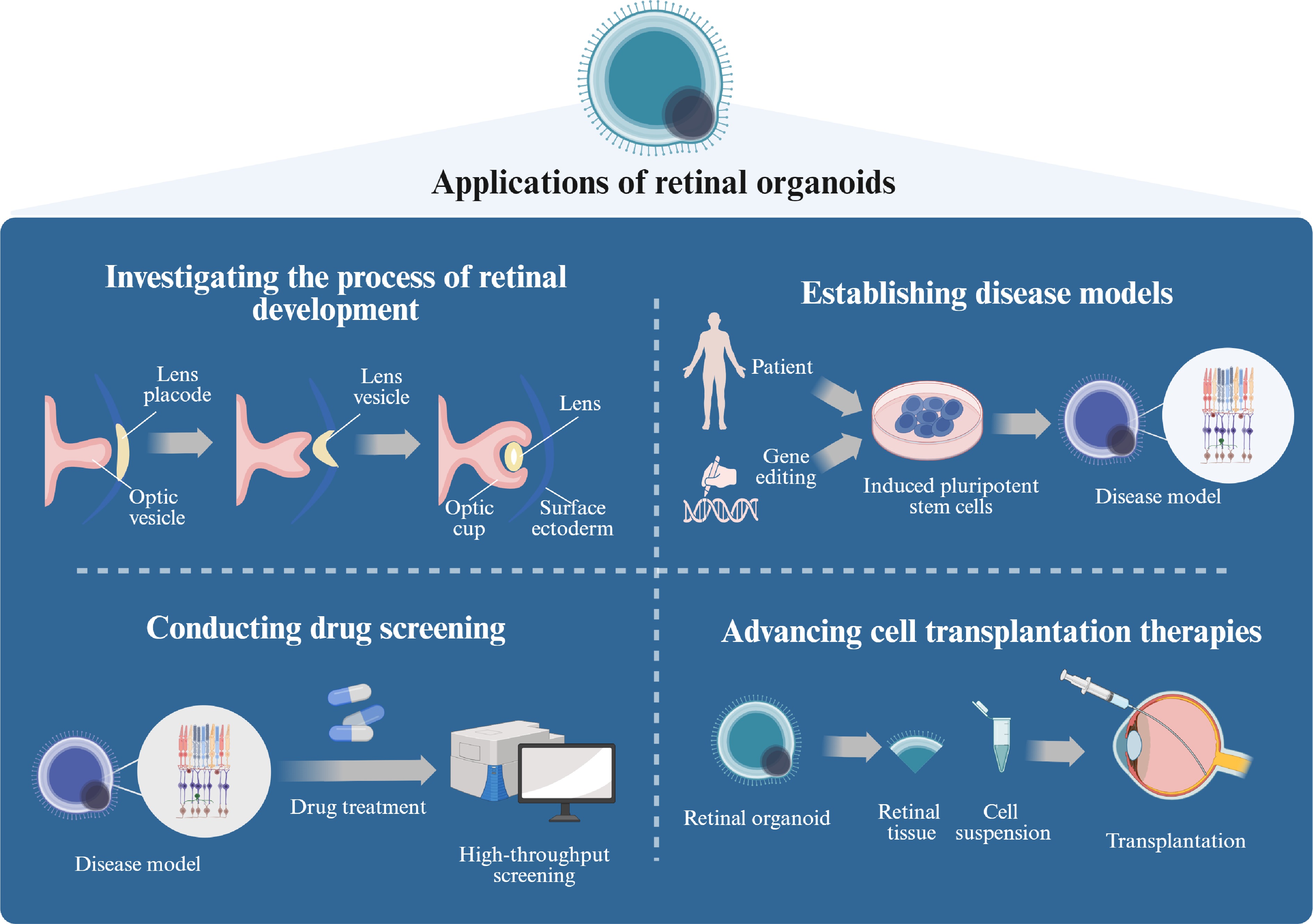 RO technology has emerged as a crucial tool for studying retinal development, disease mechanisms, and drug screening (see Fig. 1). Before alternative therapies were developed, organoids were initially employed to create in vitro models of diseases. This approach aimed to enhance our understanding of disease mechanisms and evaluate potential treatments. Prof. Jin's research group utilized the Sendai virus to induce nonintegrating induced pluripotent stem cells (iPSCs) in the fibroblasts from patients. They aimed to develop patient-specific rod cell models to study RP caused by Rgo mutations. Rod cells derived from patients' iPSCs exhibited classic endoplasmic reticulum stress characteristics and replicated the disease phenotype in vitro[19]. Michael A. Dyer's research group differentiated iPSCs carrying genetic mutations associated with retinoblastoma (Rb) into ROs. They then transplanted these organoids into the eyes of mice, effectively creating a model for Rb[20]. Compared with traditional animal models and 2D cell culture techniques, human organoid systems offer models that closely mimic human physiological and pathological conditions in drug research while also reducing reliance on animals and lowering development costs. By establishing a late-stage retinoblastoma organoid model, researchers assessed the impact of drugs on cell cycle disruption and genotoxic effects. The combined treatmentof melphalan and topotecan effectively targeted tumor conecells within the organoids[21]. This organoid model offers a valuable opportunity for in vitro screening of drug accessibility and sensitivity.