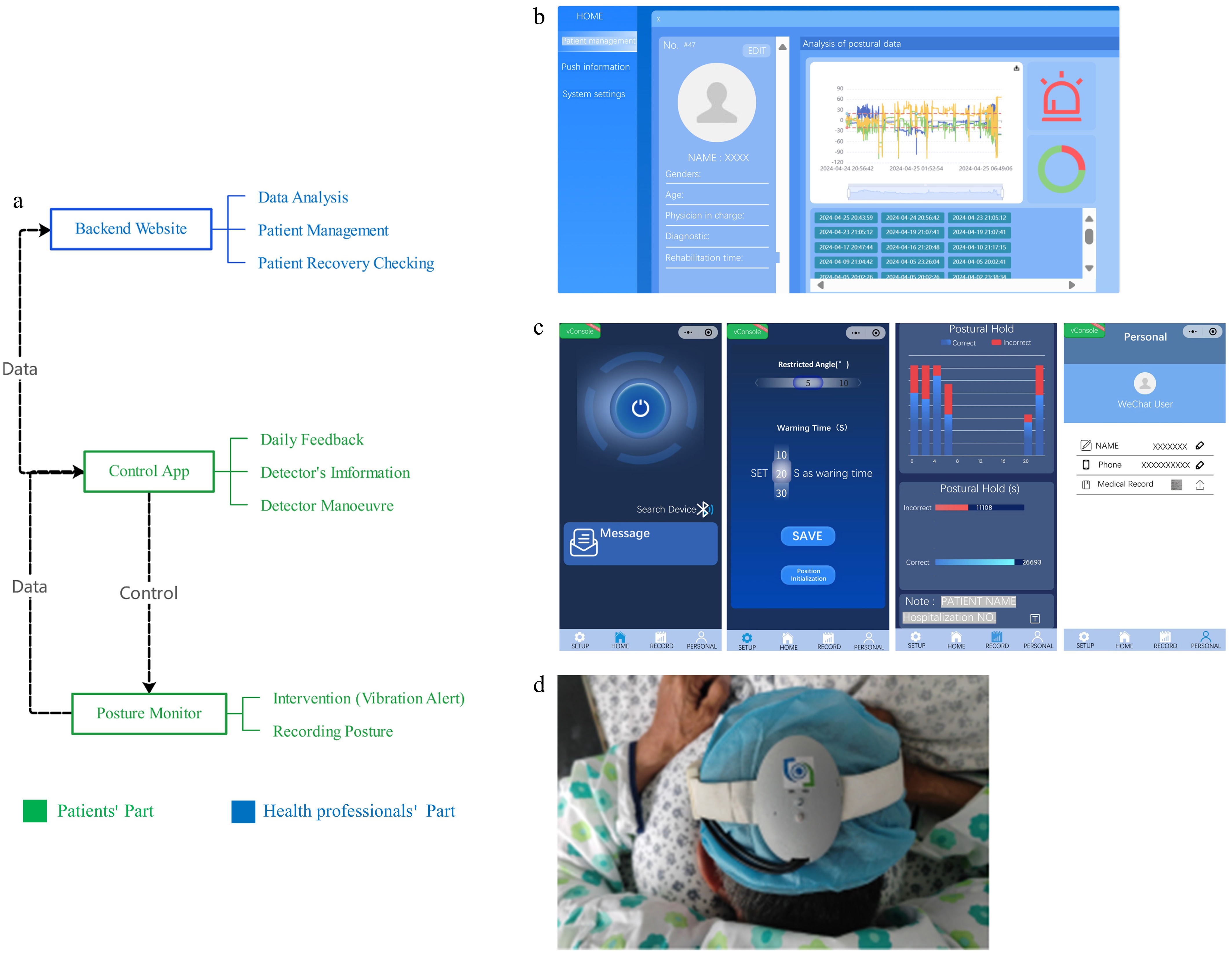 Head posture monitoring system's architecture. (a) System overview. The posture monitor was controlled by the app. The posture data are transferred to the app, which uploaded it to the backend website. (b) The backend website provides basic information and the posture compliance data of each patient for health professionals. (c) The control app controls the monitor, sets the target posture, and demonstrates the compliance results for each session. (d) The head posture monitor can detect posture and provides vibration alerts.