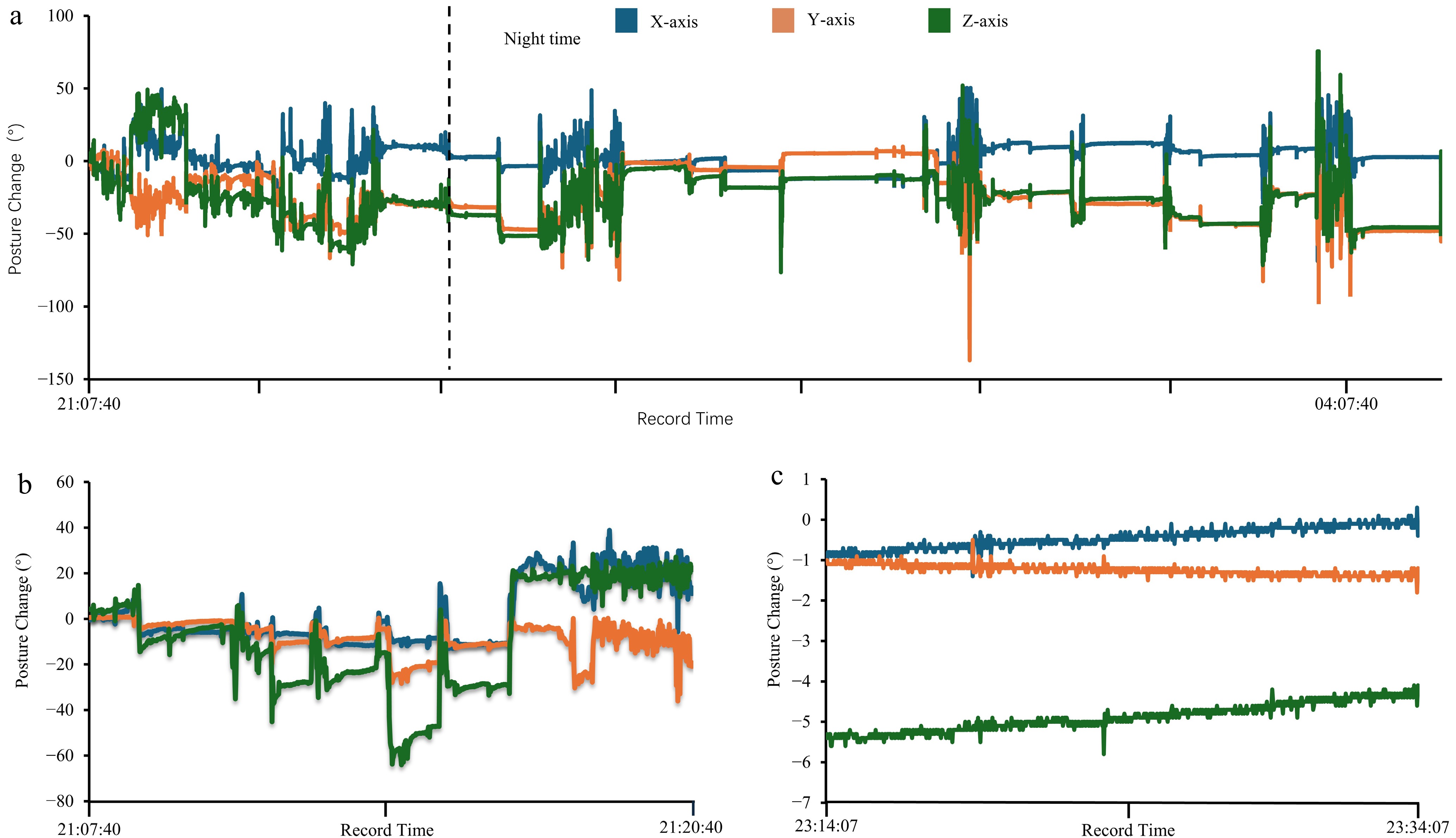 (a) An example of three-axis posture angles changes over time at night. The dashed line indicates the start of the selected nighttime data. (b) Unstable posture angles with maximum change > 100°. (c) Stable posture angle with changes in all three axes < 2°.