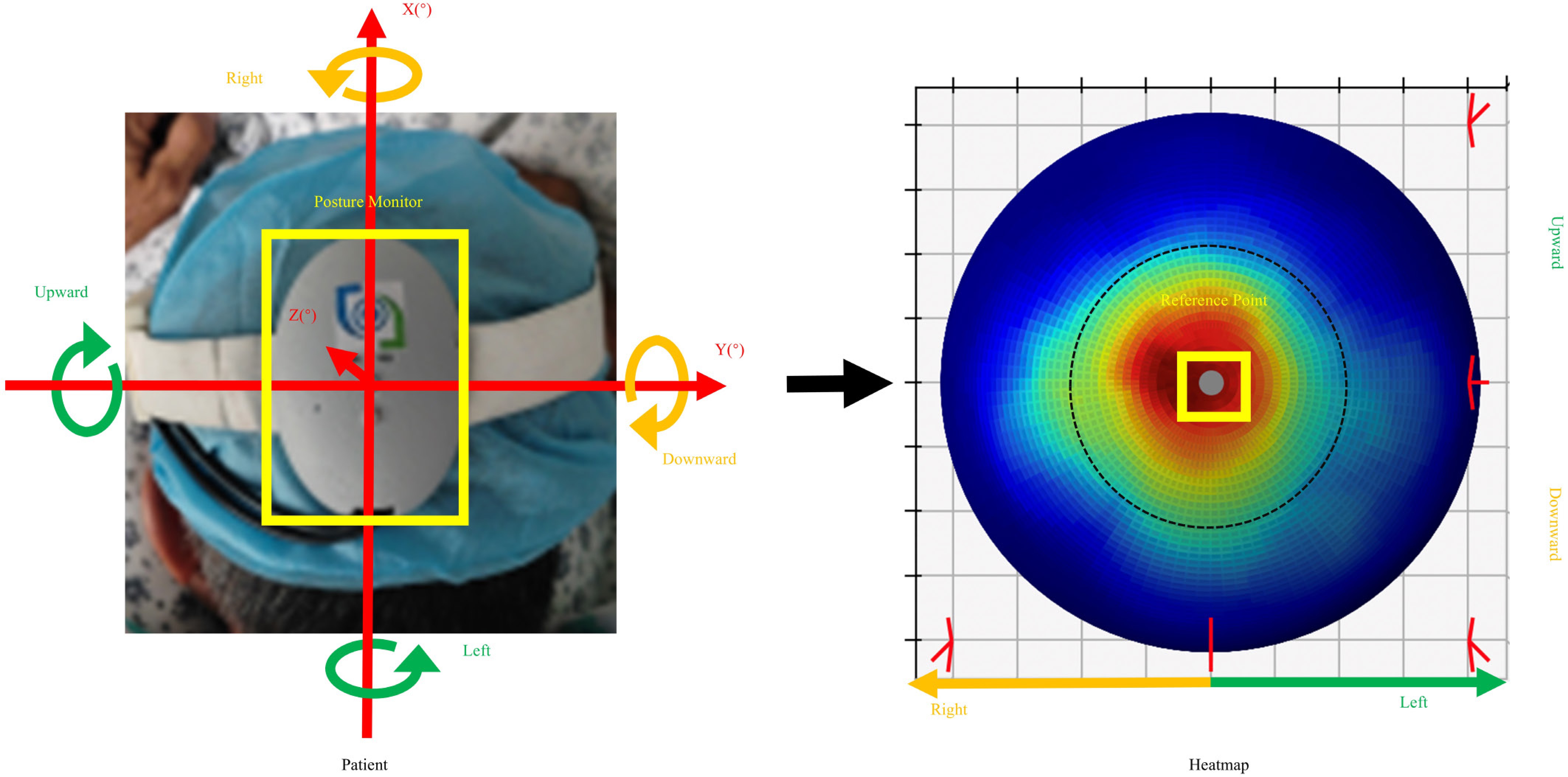 Direction of the heatmap corresponding to the patient's posture. The posture data on the angle and direction of rotation along the axis were projected onto a spherical surface as a point. The distribution of posture data for each second generated a heatmap. The reference point indicates the original posture.