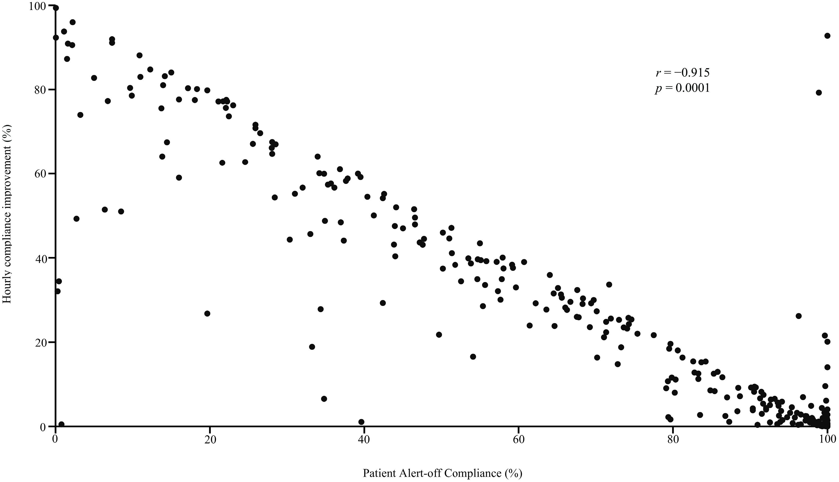 Scatter plot showing statistically significant correlations between hourly compliance improvements and patient compliance in the alert-off period.