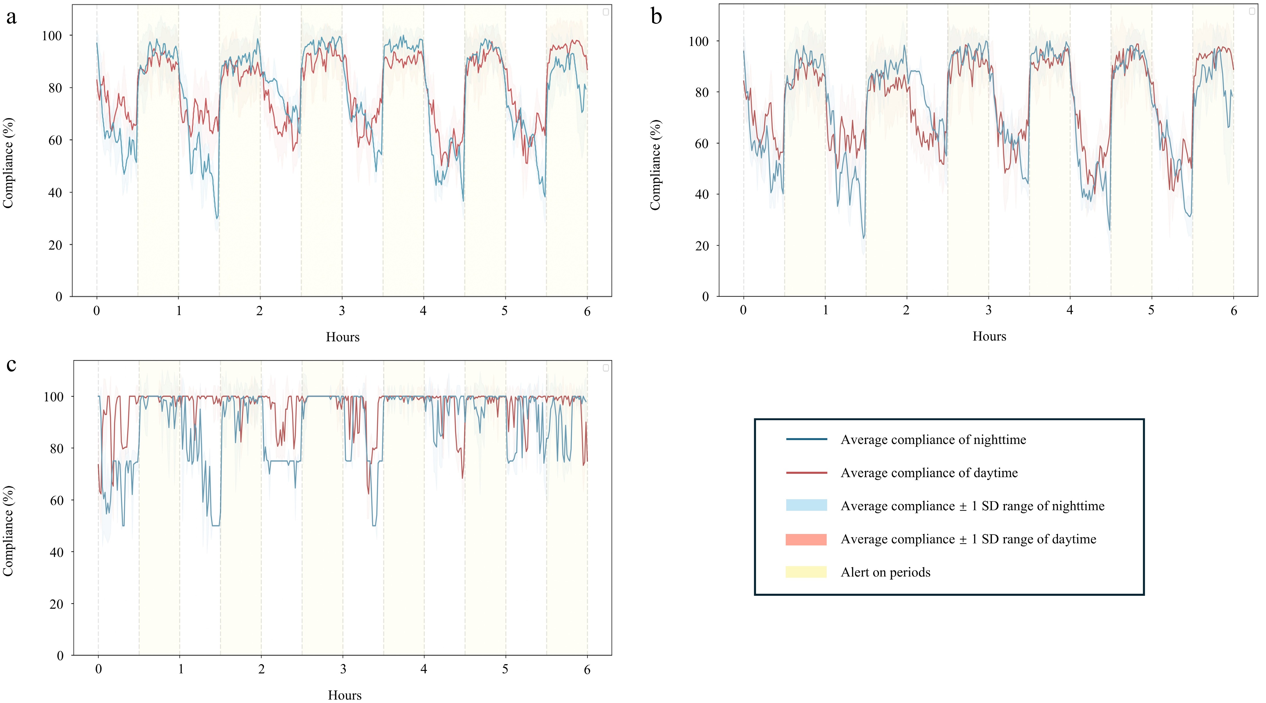 • The changes in average compliance with time are shown in Fig. 6. Generally, compliance was lower during the alert-off periods compared with the alert-on periods. Compliance in Fowler's posture reached nearly 100% during alert-on periods.