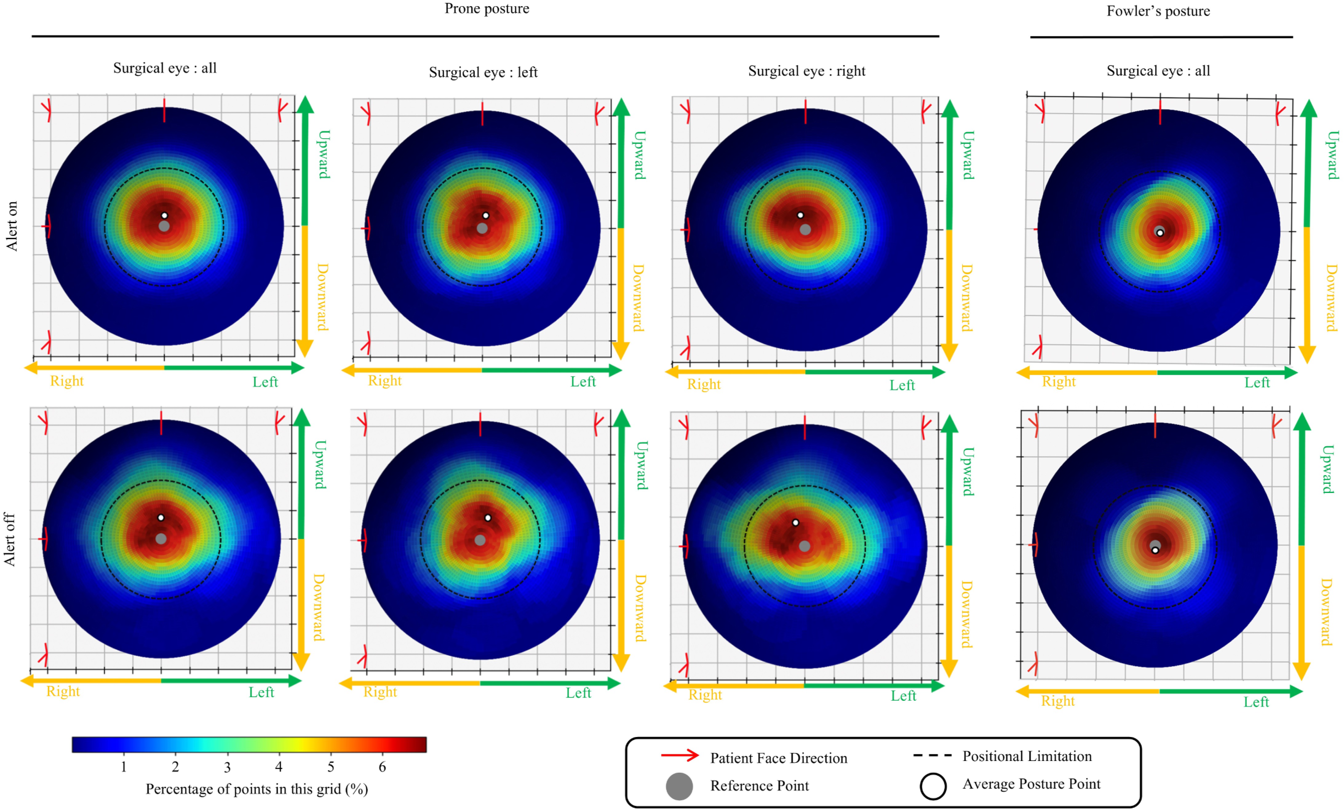 • The heatmap analysis of patients in the prone position is shown in Fig. 7. The average deviation in the sagittal plane was upward, regardless of whether the left or right eye was operated on. However, in the horizontal plane, the average deviation was to the left when the left eye was operated on, and to the right when the right eye was operated. The average deviation during alert-on periods was less compared with alert-off periods, although the direction of deviation was similar. In contrast, there was no significant head tilting observed in patients with Fowler's posture (Fig. 7).