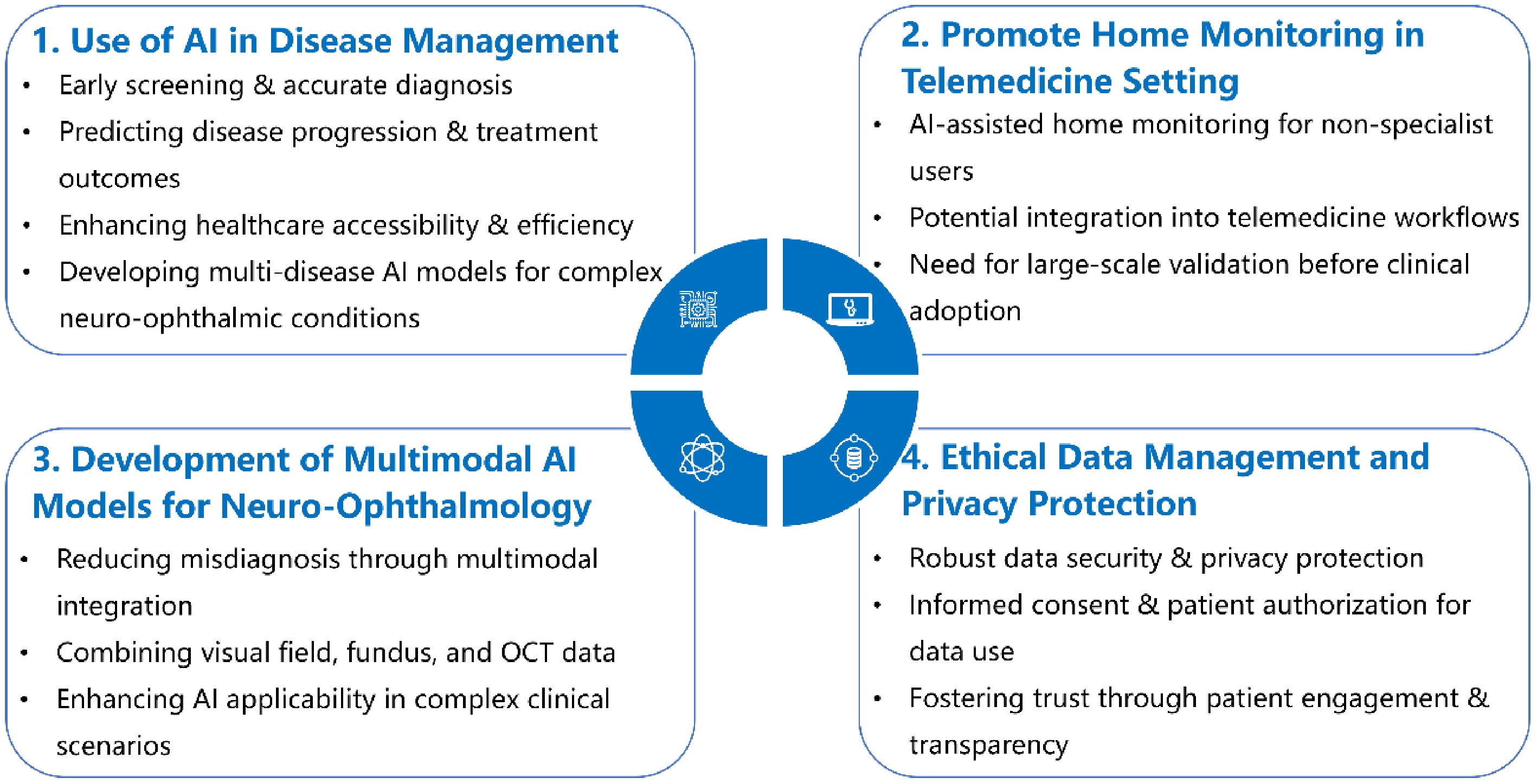 • The Neuro-Ophthalmology Vision Academy underscores the promising role of AI technologies in transforming neuro-ophthalmic practice. AI can be integrated into various stages of disease management, including early screening, accurate diagnosis, standardized grading of disease severity, prediction of disease progression, and forecasting of treatment outcomes to support personalized care. Furthermore, AI offers the potential to address the shortage of neuro-ophthalmology specialists − particularly in remote or underserved areas − by providing cost-effective, high-value tools that enhance healthcare's accessibility and efficiency. While current AI research in ophthalmology often focuses on dual classification tasks, given the complexity of conditions involving both the optic nerve and ocular motor systems, it is critical to develop advanced, multi-disease AI models capable of concurrently diagnosing a broader spectrum of disorders. Such comprehensive systems are essential for improving diagnostic precision, optimizing treatment strategies, and ultimately enhancing patient outcomes in neuro-ophthalmic care.