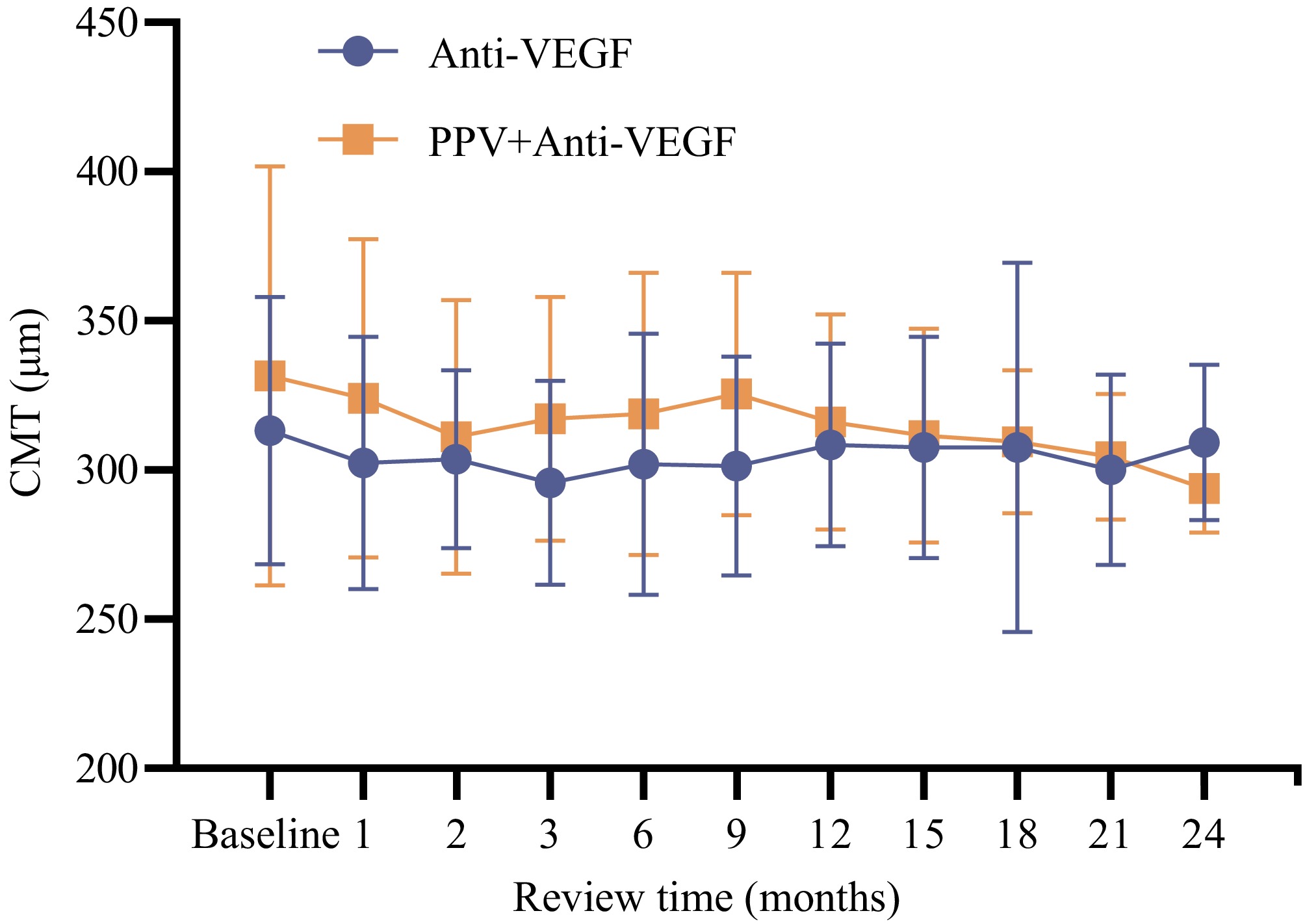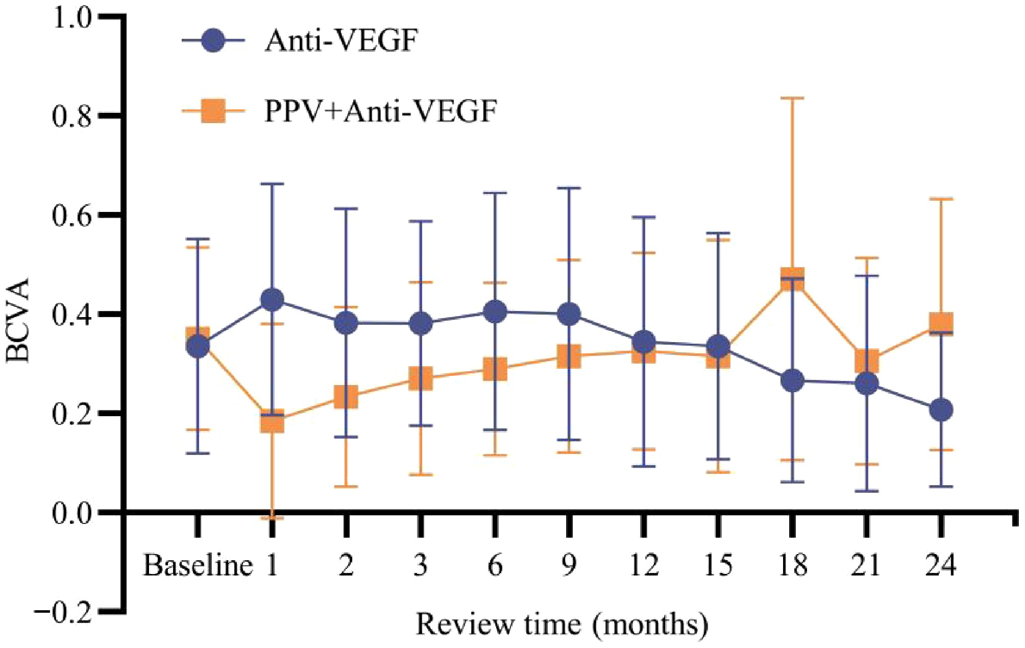 Therefore, in contrast to patients treated with anti-VEGF alone, those who underwent PPV combined with anti-VEGF treatment achieved a more favorable retinal structure following the alleviation of vitreoretinal traction, enabling the BCVA to remain stable after 9 months of treatment.