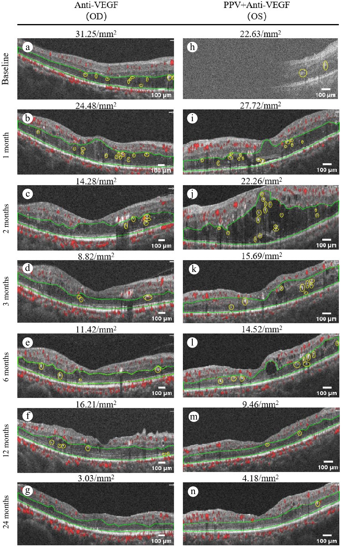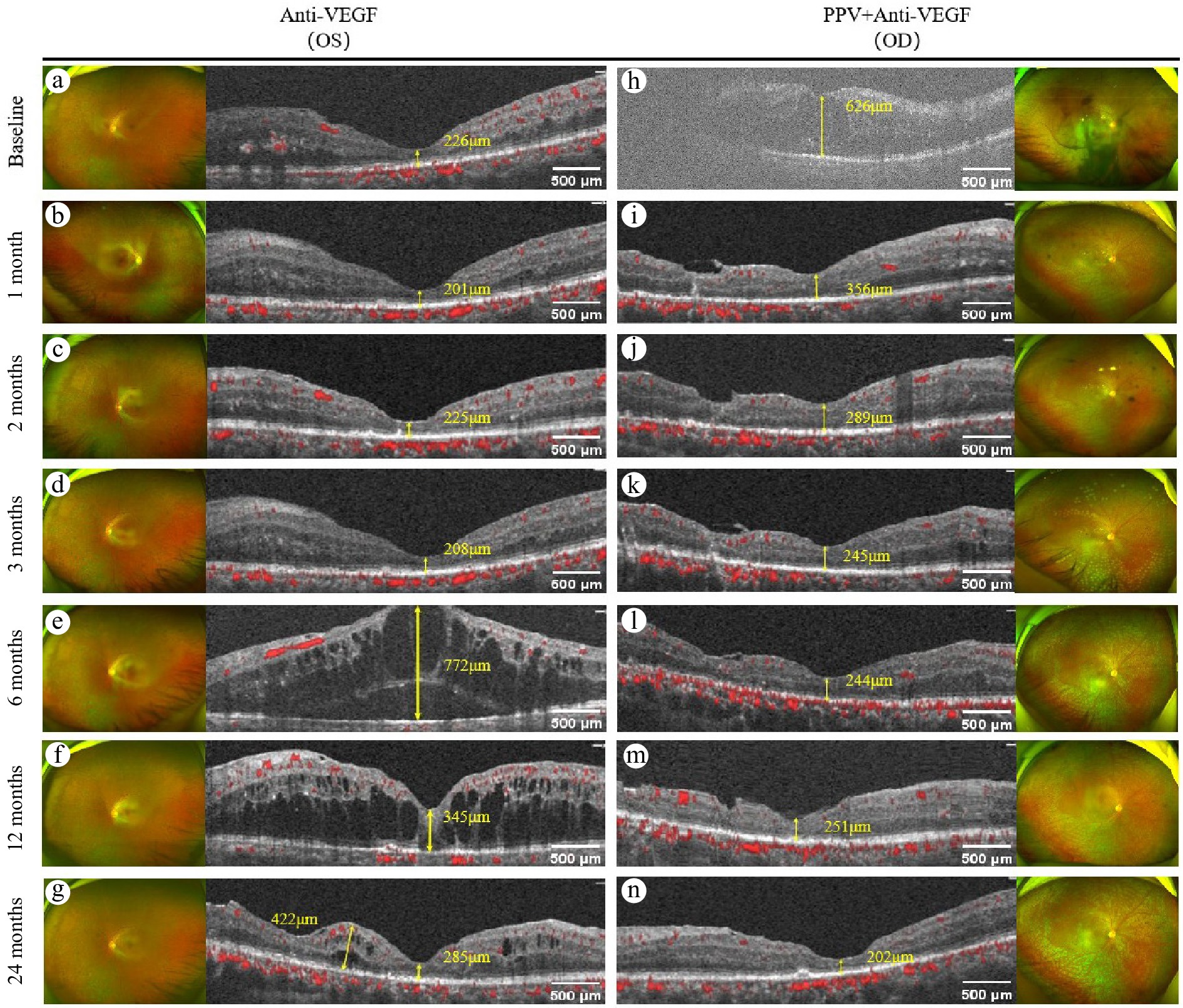 Comparison of the changes in CMT values of the same patient after different treatment methods. (a)−(g) Show the changes in CMT on OCTA in the left eye after anti-VEGF therapy. Among them: (a) The CMT value at baseline is 226 μm. (b) The CMT value is 201μm after 1 month of treatment. (c) The CMT value is 225 μm after 2 months of treatment. (d) The CMT value is 208 μm after 3 months of treatment. (e) The CMT value is 772 μm after 6 months of treatment. (f) The CMT value is 345 μm after 12 months of treatment. (g) The CMT value is 285 μm after 24 months of treatment. (h)−(n) Show the changes in CMT on OCTA in the right eye following PPV combined with anti-VEGF therapy. Among them: (h) The CMT value at baseline is 626 μm. (i) The CMT value is 356 μm after 1 month of treatment. (j) The CMT value is 289 μm after 2 months of treatment. (k) The CMT value is 245 μm after 3 months of treatment. (l) The CMT value is 244 μm after 6 months of treatment. (m) The CMT value is 251 μm after 12 months of treatment. (n) The CMT value is 202 μm after 24 months of treatment.