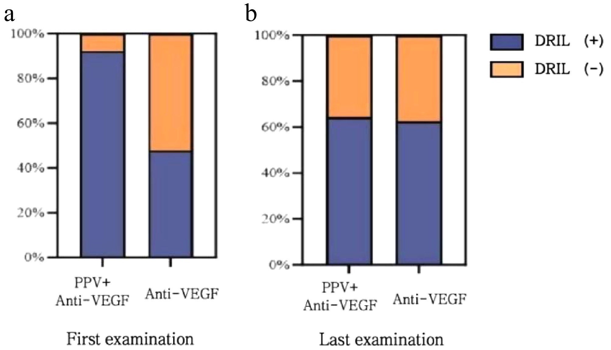 Comparison of the occurrence rates of DRIL at the first diagnosis and the last visit between the two groups of patients. (a) At the first diagnosis, the incidence rate of DRIL in the multimodal treatment group was 92.3%, and that in the standalone treatment group was 47.8%. The comparison between the two groups showed p = 0.0024; (b) After 24 months of treatment, the incidence rate of DRIL in the multimodal treatment group was 65.3%, and that in the standalone treatment group was 61.5%. The comparison between the two groups showed p = 0.455.