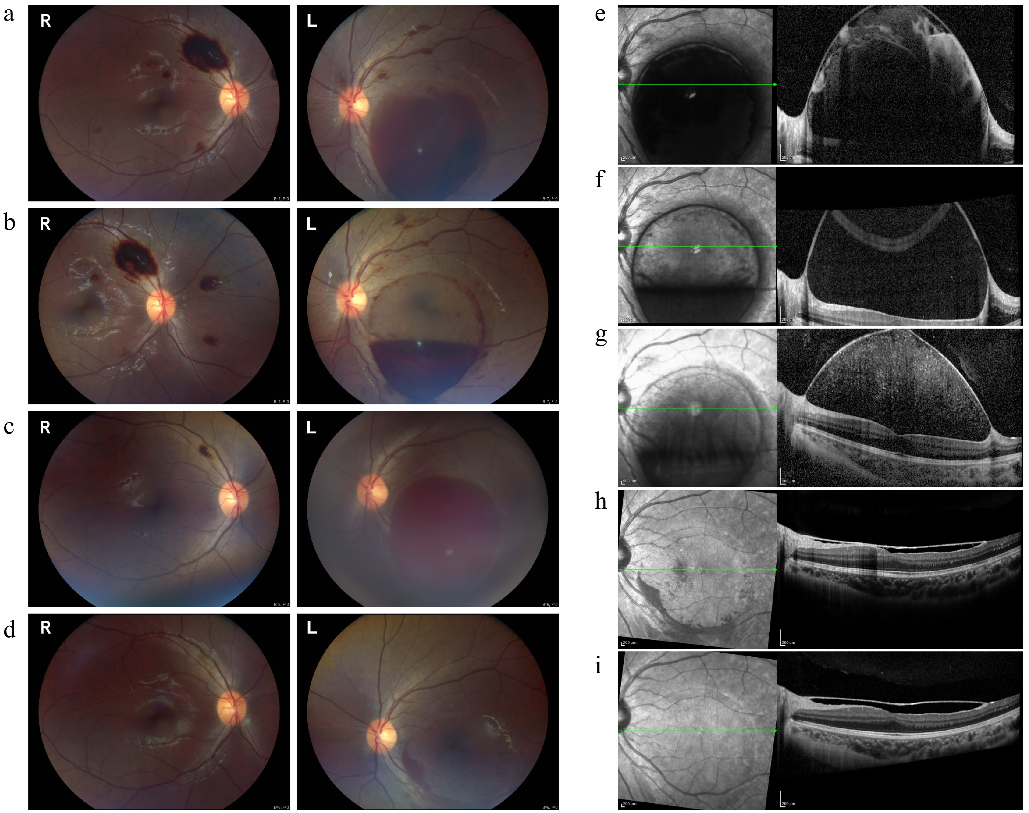 Fundus and OCT images at various stages of treatment in Case 1. (a) Preinjection fundus image showing extensive preretinal hemorrhage in both eyes, with a larger sub-ILM hemorrhage affecting the macula in the left eye. (b) Two days after the first injection, partial absorption of the sub-ILM hemorrhage was observed in the left eye. (c) Eight weeks later, recurrent macular hemorrhage appeared in the left eye, while the right eye's hemorrhage resolved. (d) Two weeks after the second injection, near-complete resolution of the left eye's hemorrhage was observed, with a small residual hemorrhage remaining. (e)–(i) OCT images showing the progression of sub-ILM hemorrhage before and after the injections: (e) Sub-ILM fluid-filled cavity before the injections; (f) partial resolution two days after the first injection; (g) recurrence of hemorrhage at eight weeks; (h) significant absorption two weeks after the second injection; (i) complete resolution at two months, with restored macular foveal contour and elevated ILM.