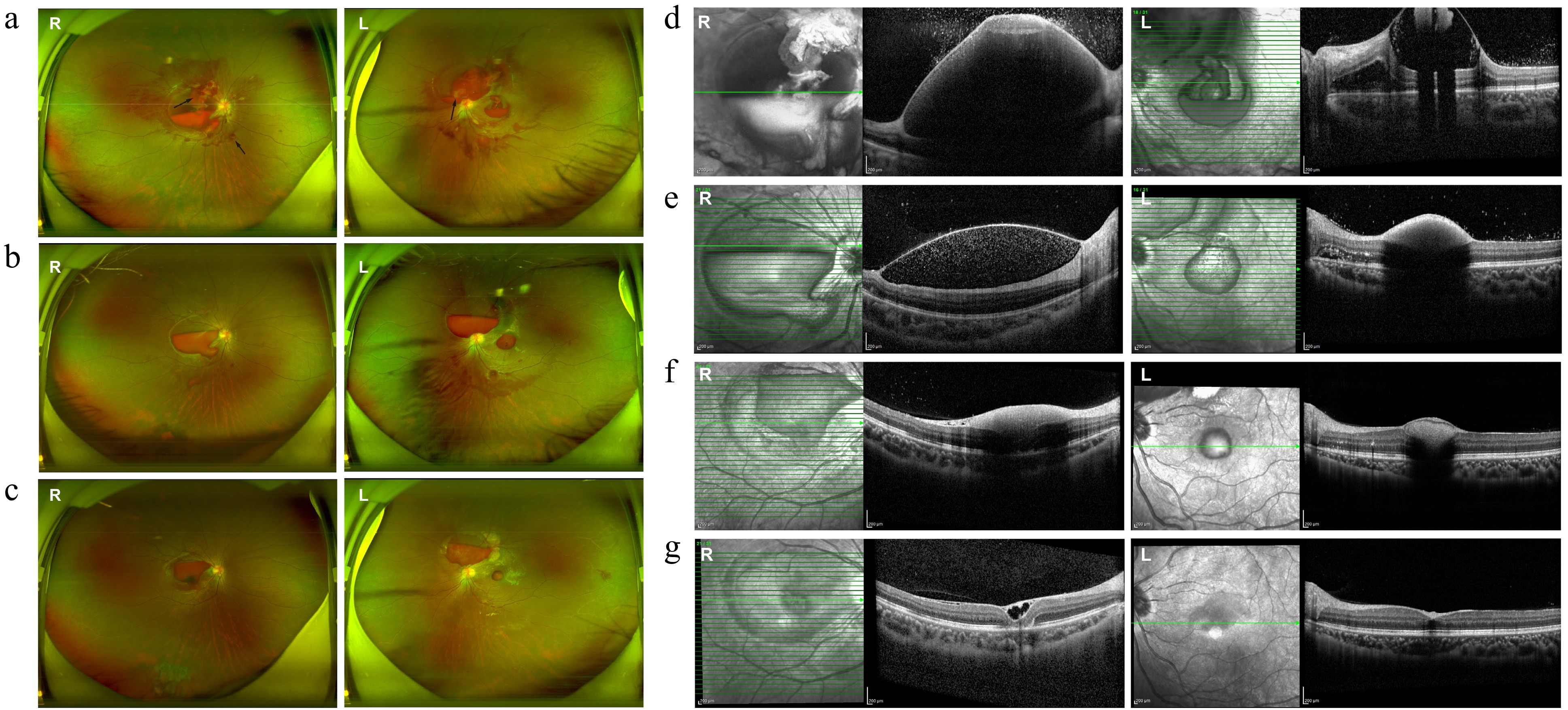 Fundus and OCT images at various stages of treatment in Case 2. (a) Preinjection fundus image showing bilateral preretinal hemorrhage, hard exudates, blurred optic disc margins, diffuse vascular tortuosity, and Roth spots (black arrows). (b) One week post-injection, partial absorption of sub-ILM hemorrhage was noted, along with the resolution of hard exudates and improved optic disc clarity. (c) Three weeks postinjection, the sub-ILM hemorrhage became darker and more localized. (d)–(g) OCT images showing progression of the sub-ILM hemorrhage: (d) Extensive sub-ILM fluid-filled cavity before the injection obscuring retinal details; (e) significant absorption at 1 week postinjection; (f) reduced ILM elevation 3 weeks postinjection with residual medium to low reflective material; (g) at the latest follow-up, the right eye showed an epiretinal membrane and small sub-ILM cavities, while the left eye exhibited a nearly normal macular contour.