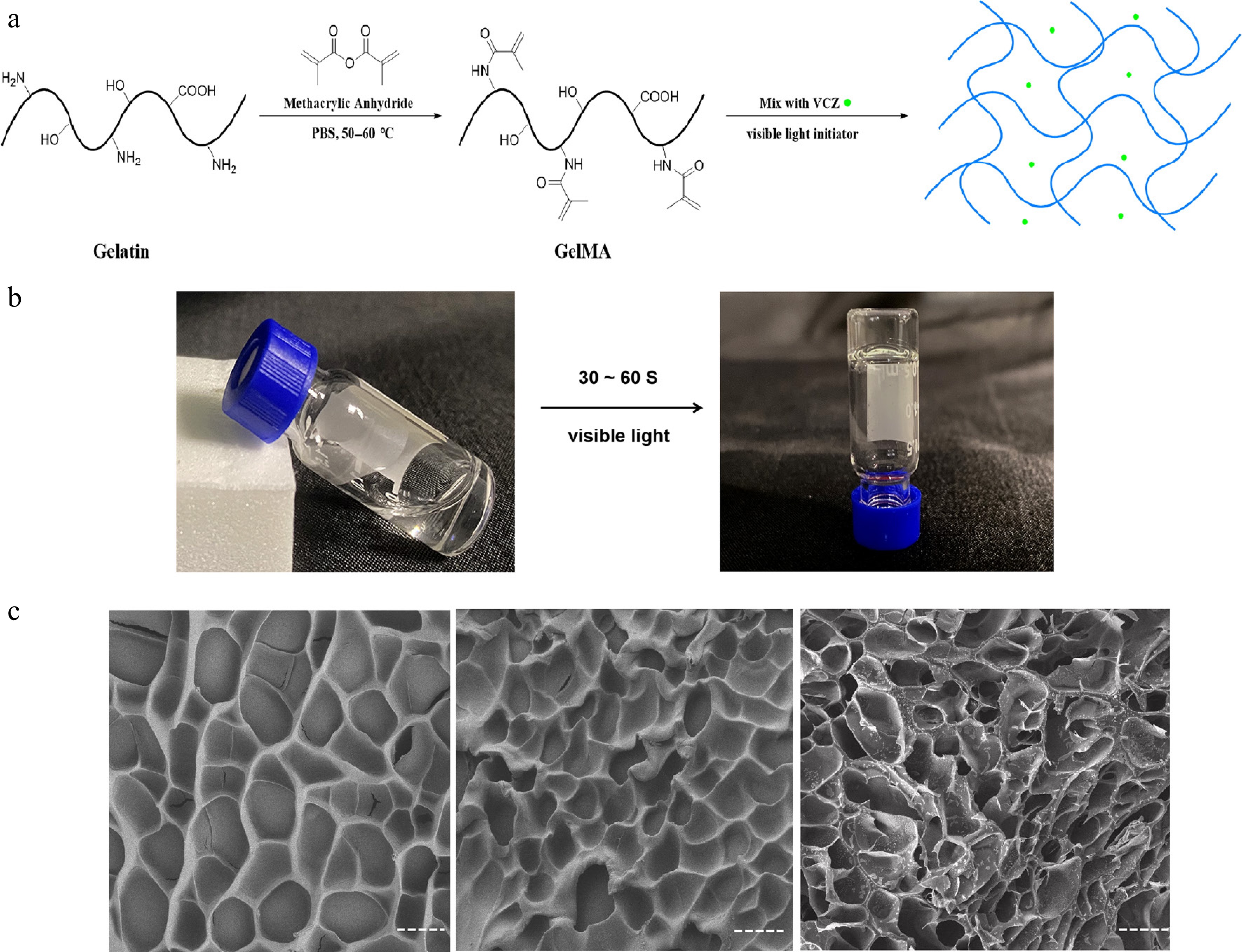 The preparation and characterization of the GelMA hydrogels. (a) Schematic illustrations of the synthesis of GelMA hydrogel with VCZ. (b) Enlarged view of the GelMA hydrogel's formation. (c) SEM images of the blank hydrogels (10% and 20% GelMA) and the drug-loaded hydrogels (10% GelMA).