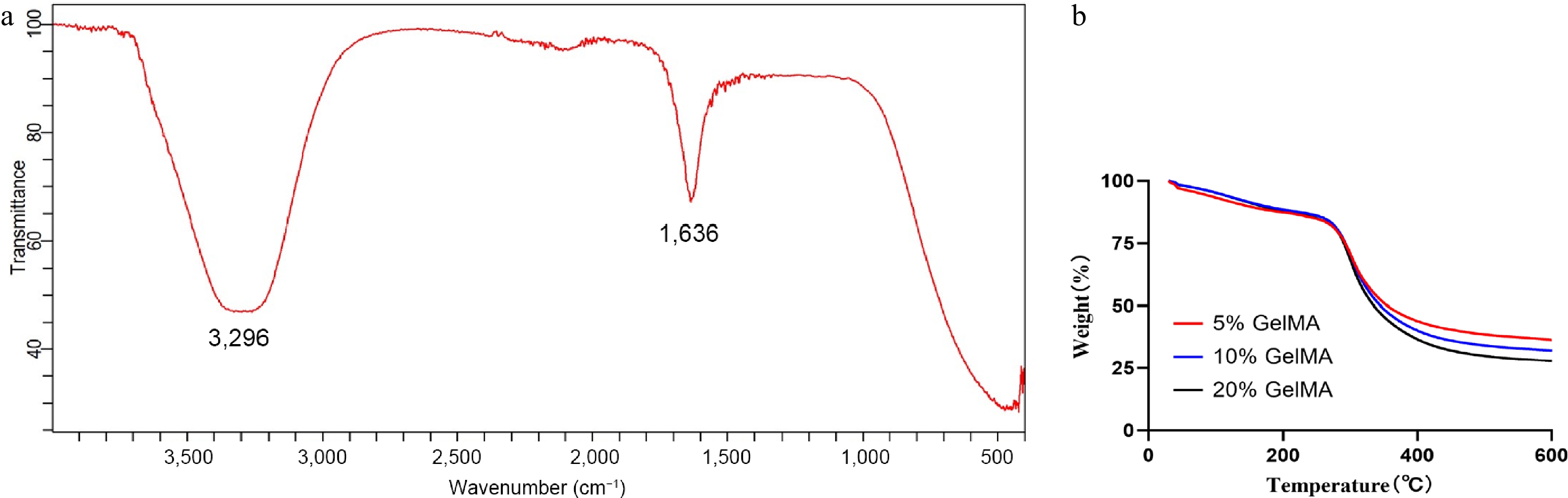 • FTIR spectroscopy confirmed the characteristic absorption bands of GelMA hydrogels (Fig. 2a). The broad peak at 3,296 cm−1 corresponded to O–H and N–H stretching vibrations, whereas the band at 1,636 cm−1 was assigned to the C=O (Amide I), indicating the presence of functional groups typical of GelMA. TGA further revealed the thermal stability of the hydrogels with different concentrations (5%, 10%, and 20%; Fig. 2b). All samples lost weight below 150 °C through water evaporation, and a major degradation occurred between 250 and 400 °C from breakdown of the polymer backbone. Among the different concentrations, the 20% GelMA hydrogel had a slightly lower weight at high temperatures.