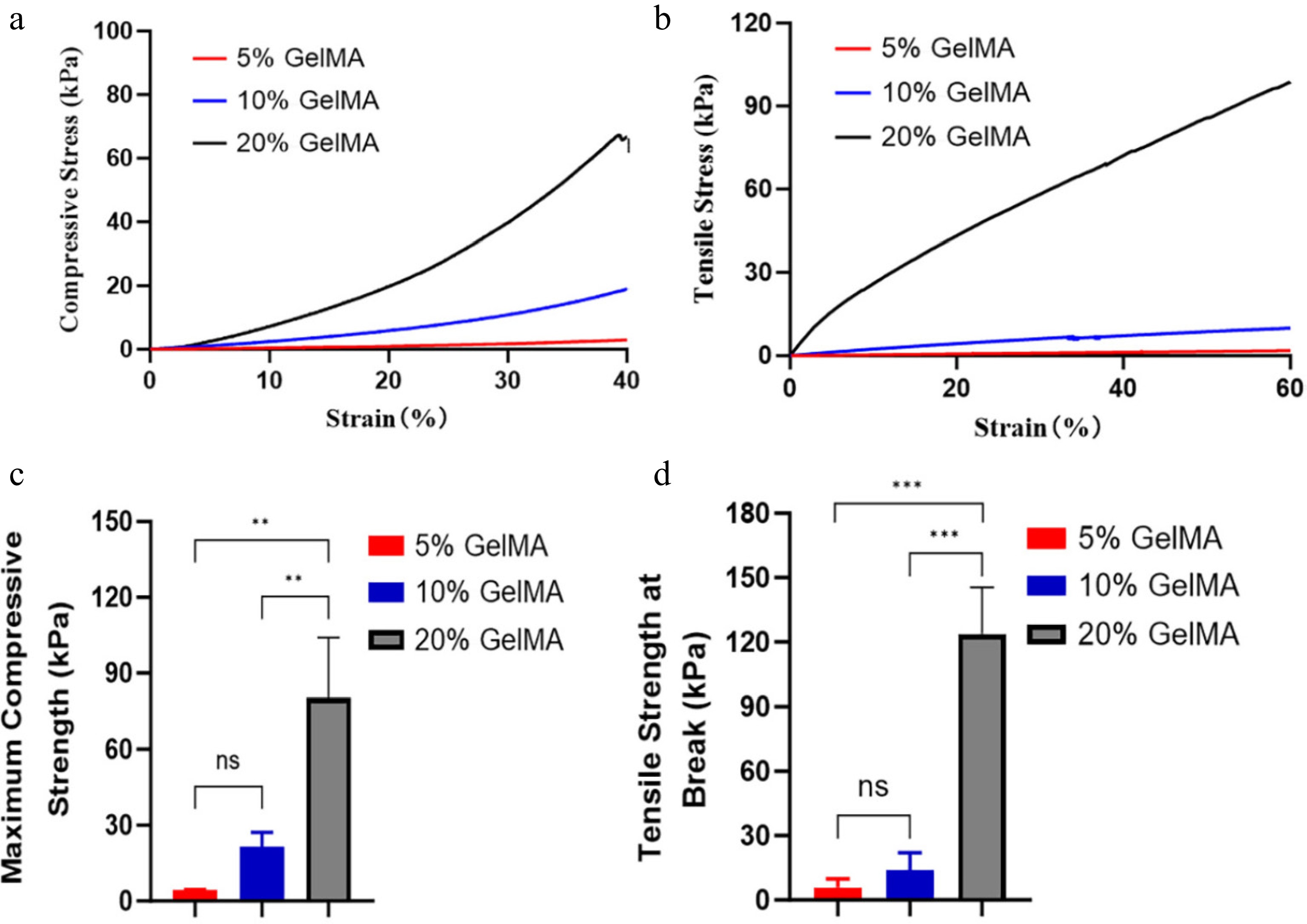 The mechanical properties of GelMA hydrogels. (a) The compressive stress–strain curve of GelMA hydrogels at different concentrations. (b) The tensile stress–strain curve of GelMA hydrogels across different concentrations. (c) The maximum compressive stress among 5%, 10%, and 20% GelMA hydrogels (p > 0.05, ANOVA). (d) Tensile modulus at breaking strength of different hydrogels (p > 0.05, ANOVA). ns > 0.05, *p < 0.05, **p < 0.01, and ***p < 0.001.