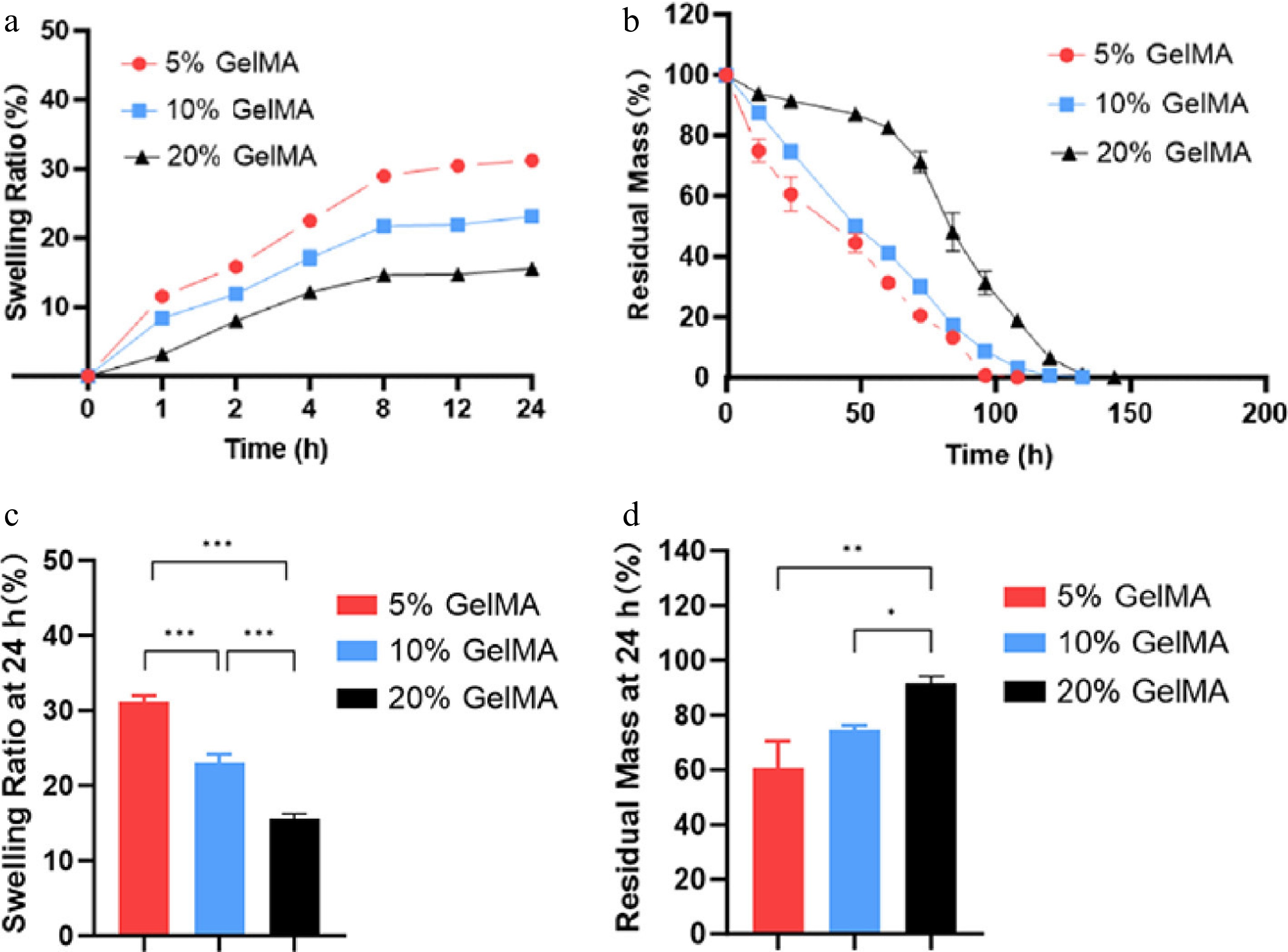 The swelling and degrading characterization of GelMA hydrogels. (a) Swelling curves of the hydrogels. (b) The remaining weight curves of the GelMA hydrogels under enzymatic hydrolysis. (c) The swelling ratio of GelMA hydrogels in PBS at 24 h. (d) The residual mass rate of GelMA hydrogels at 24 h. ns > 0.05, *p < 0.05, **p < 0.01, and ***p < 0.001.