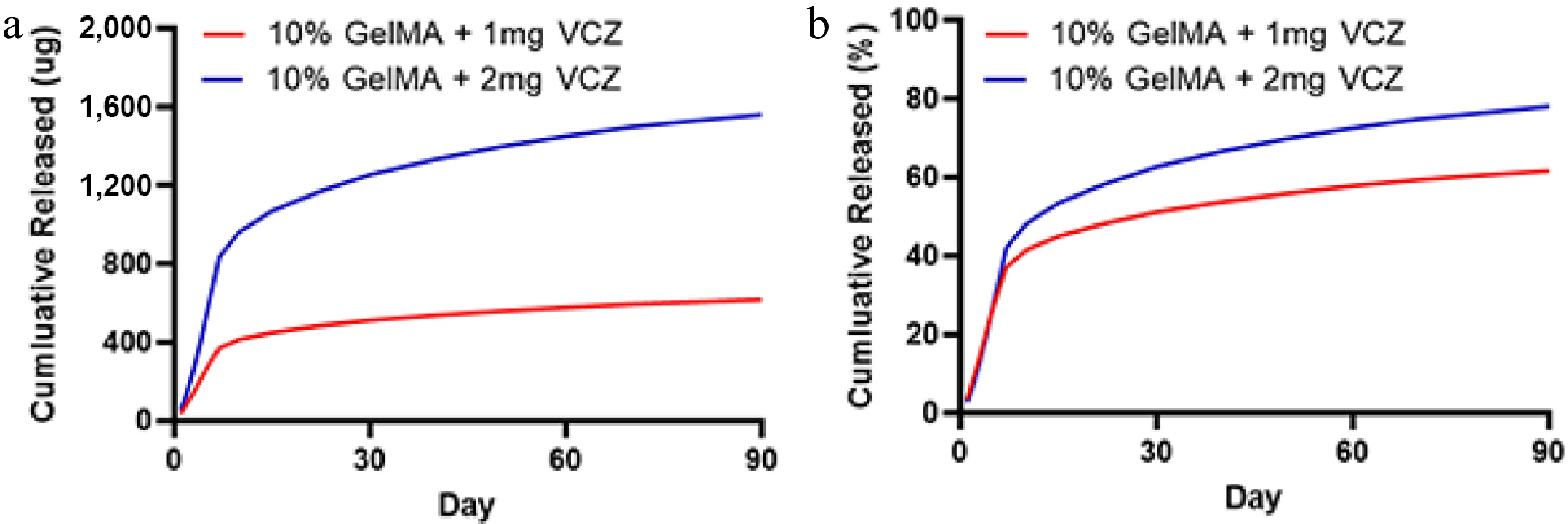 The release characteristics of the GelMA hydrogels with VCZ at different concentrations after incubation in drug release media (PBS). (a) The quantification of VCZ released from 10% GelMA hydrogel loaded with 1 and 2 mg after incubation in the drug release media (PBS). (b) The cumulative release rate of VCZ of the drug-loaded hydrogels at 37 °C in PBS.