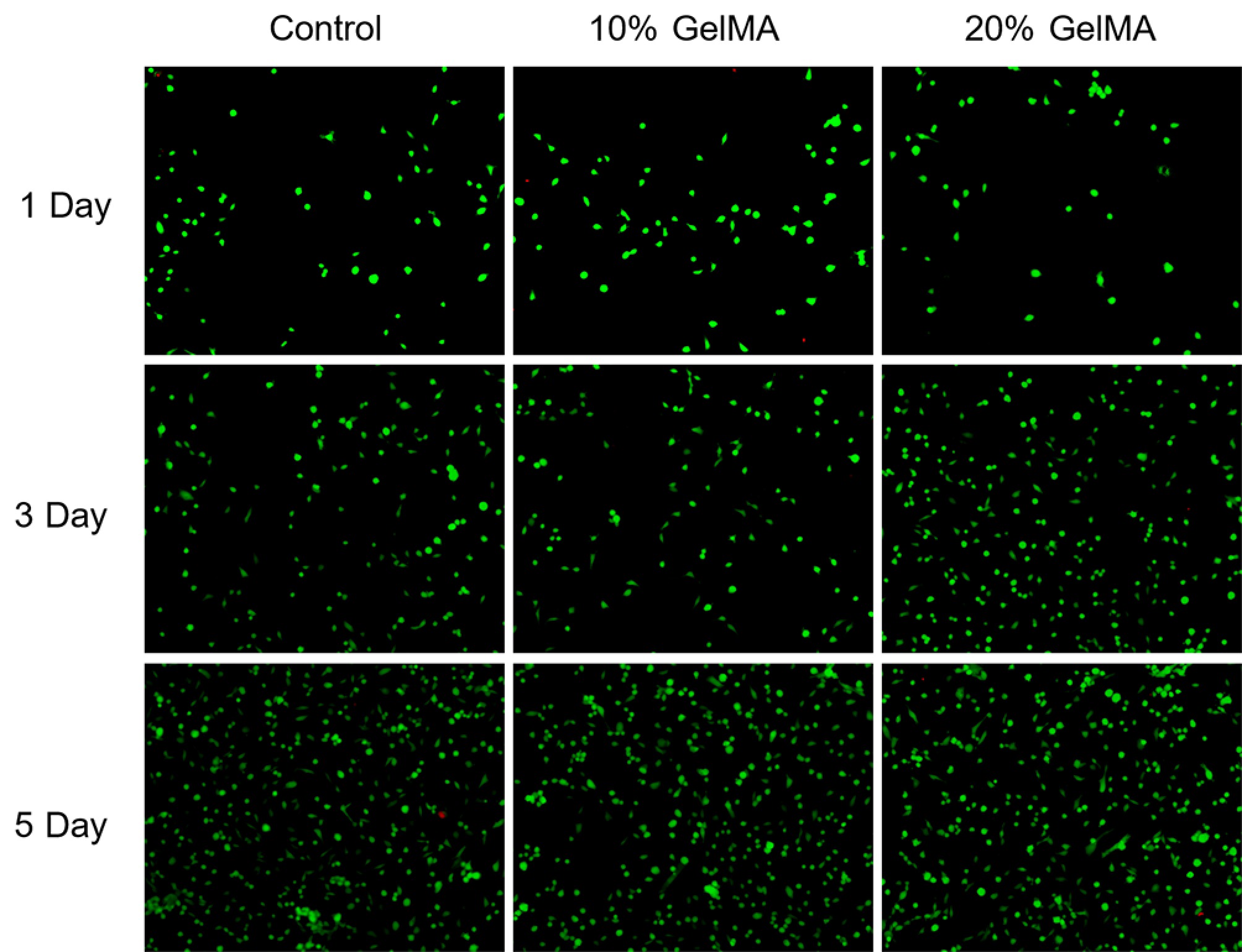 The live and dead cells assay after 1, 3, and 5 days of the control, 10% GelMA, and 20% GelMA hydrogels (live HRPE cells are in green and dead HRPE cells are in red).
