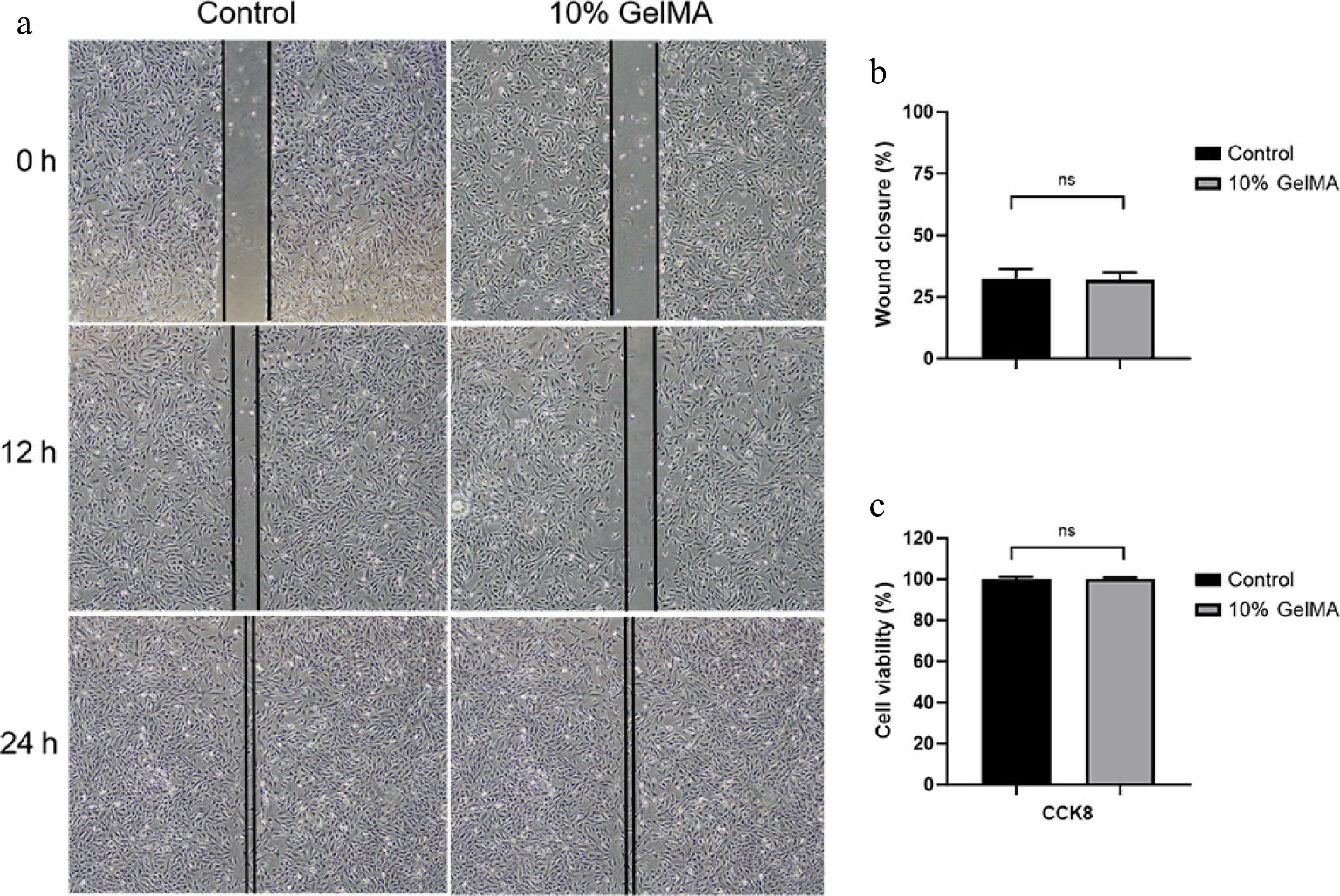 Assessment of the cytocompatibility of GelMA hydrogels. (a) Microscopy images of the HRPE cell migration scratch assay at 0, 12, and 24 h. (b) The wound closure rate of cells at 12 h (p > 0.05, t-test). (c) The cell viability was assessed using the CCK8 assay (p > 0.05, t-test). ns > 0.05.