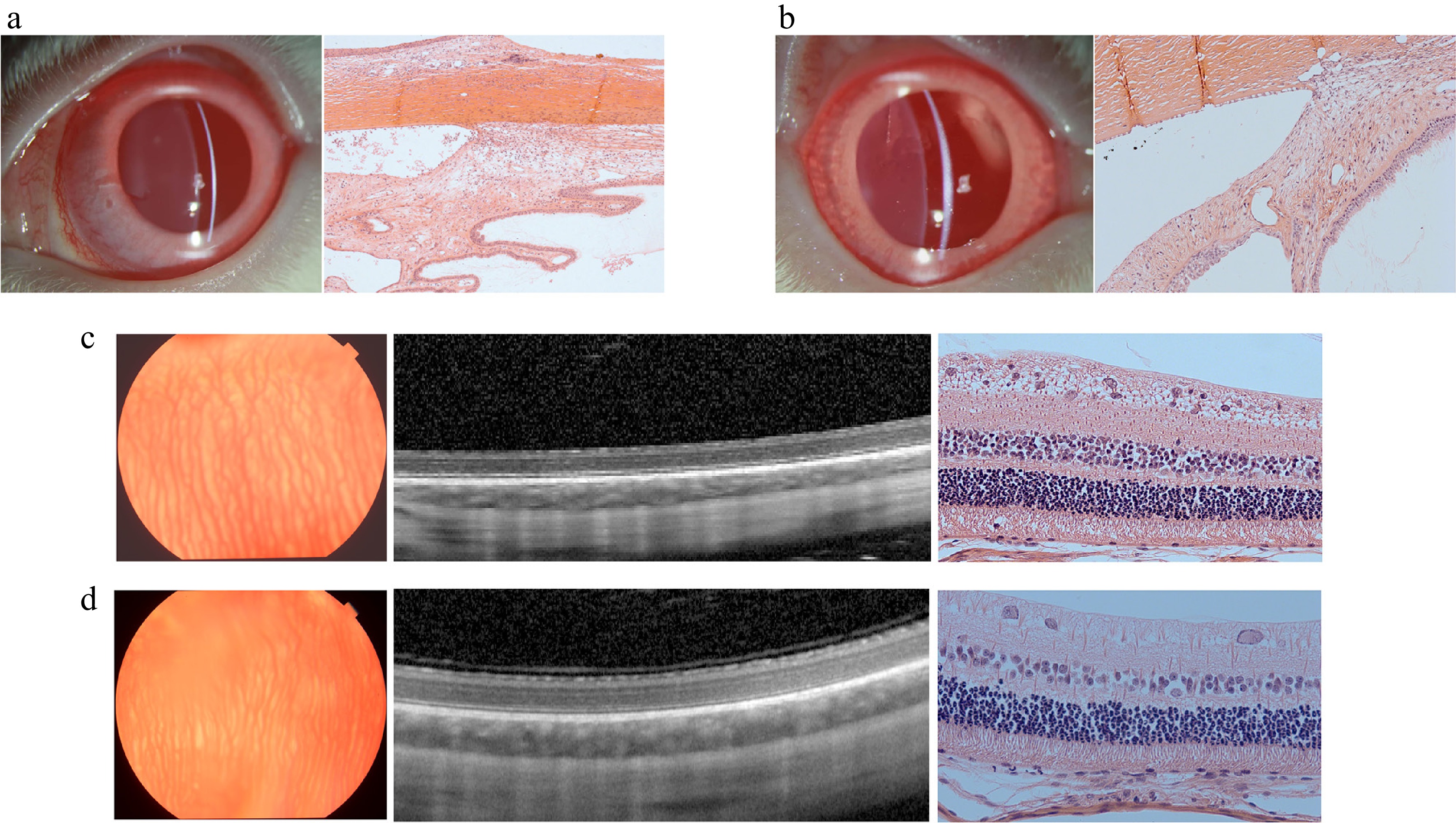 Images of the biocompatibility in vivo of the control group and GelMA hydrogel group after 2 months. (a) Slit-lamp photo and H&E staining light photomicrographs of the anterior chamber angle in the control (balanced salt solution) group. (b) Slit-lamp photo and H&E staining light photomicrograph of the anterior chamber angle in the 10% GelMA group. (c) Fundus photo, OCT images, and H&E staining light photomicrograph of the retina in the control (balanced salt solution) group. (d) The fundus photo, OCT images, and H&E staining light photomicrograph of the retina in the 10% GelMA group.
