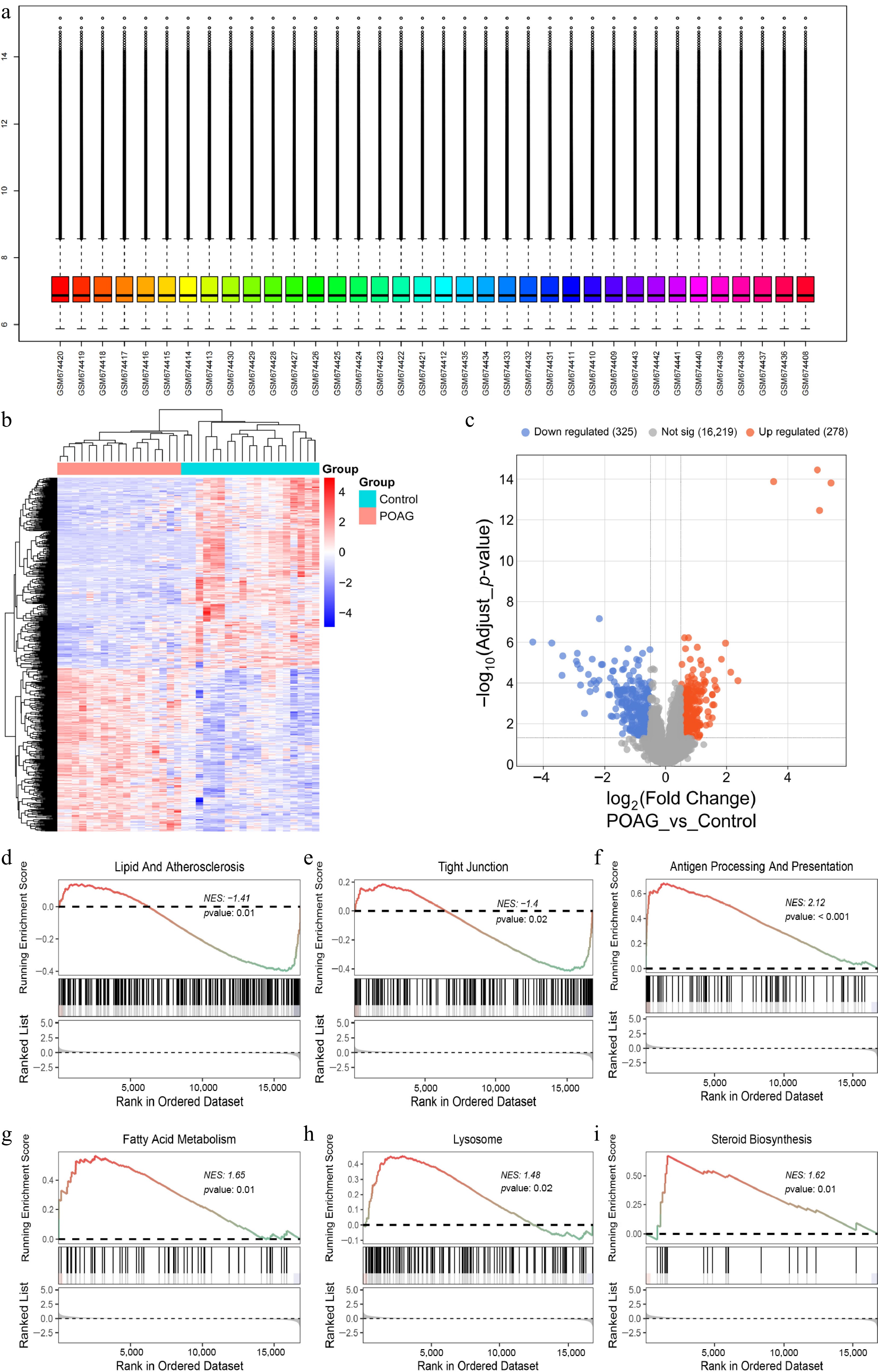 Screening DEGs in POAG and GSEA analysis. (a) The GSE27276 dataset was normalized using the 'normalizeBetweenArrays' function in R. (b) Heatmap illustrates the 603 DEGs between the POAG group, and the control group (325 downregulated; 278 upregulated, |log2FC| > 0.5, p < 0.05). (c) Volcano plot illustrates the 603 DEGs by comparing the POAG group with the control group (325 downregulated; 278 upregulated, |log2FC| > 0.5, p < 0.05). GSEA of POAG-DEGs mapping to GO pathway, (d) Lipid and atherosclerosis, (e) tight junction, (f) antigen processing and presentation, (g) fatty acid metabolism, (h) lysosome, (i) steroid biosynthesis.