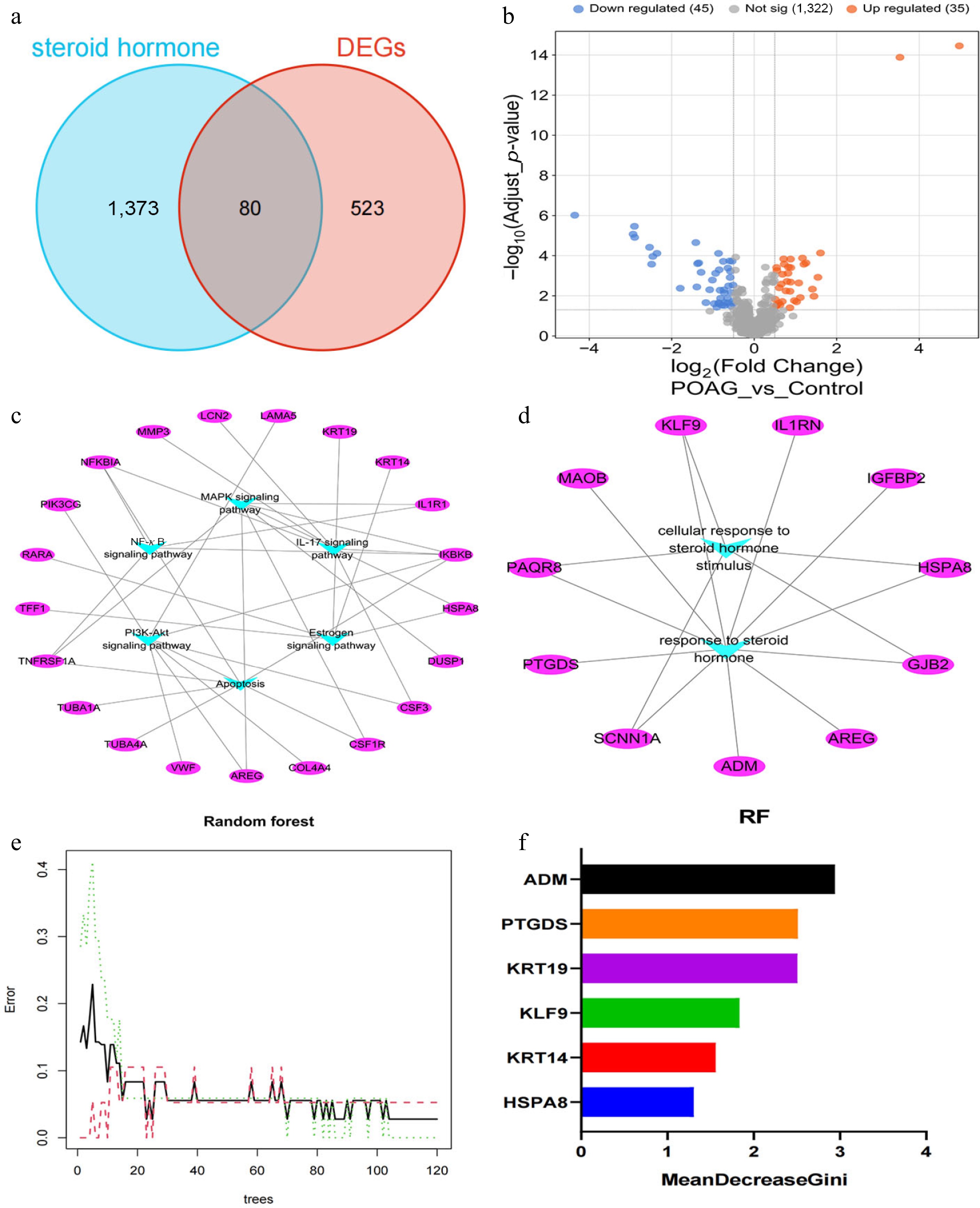 Identification of SH-related DEGs in POAG. (a) Venn diagram illustrates the intersection of DEGs in POAG and SH-regulated genes. (b) Volcano plot illustrates the SH-related DEGs in POAG (45 downregulated; 35 upregulated). (c) KEGG pathway analysis exhibited that the top six enriched signaling pathways of 80 SH-related DEGs include MAPK, NF-κB, IL-17, PI3K-Akt, apoptosis, and estrogen signaling pathways, with the 21 key genes embedded within these pathways (Supplementary Table S2). (d) GO analysis demonstrated that IGFBP2, ADM, IL1RN, PAQR8, HSPA8, AREG, PTGDS, SCNN1A, GJB2, MAOB, and KLF9 were enriched in the category of response to SHs (Supplementary Table S3). (e) Error plot for random forest model as a function of the number of trees. The black line represents the out-of-bag error, the green dashed line represents the training error, and the red dashed line represents the test error. (f) The bar chart of the MeanDecreaseGini parameters of HSPA8, KRT14, KLF9, KRT19, PTGDS, and ADM.