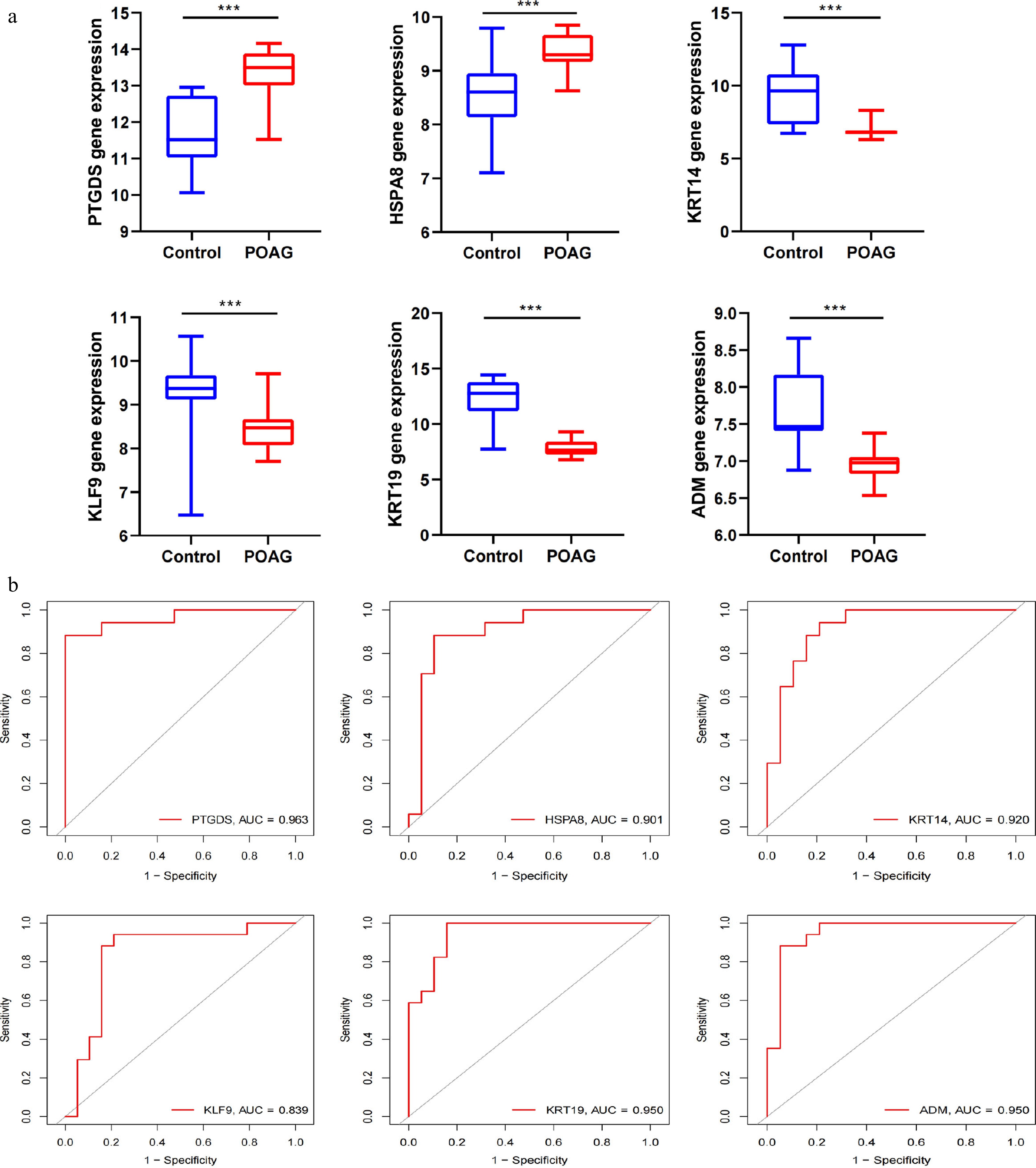 • Upon identifying six SH-related DEGs in POAG, a comprehensive analysis was conducted to evaluate their expression differences between normal and POAG tissues. The results demonstrated that, in the POAG group, there was a significant decrease in the expression levels of KRT14, KLF9, KRT19, and ADM, while the expression levels of HSPA8 and PTGDS showed a notable increase (Fig. 3a). To evaluate the diagnostic performance and quantify the predictive accuracy, ROC curve analysis was conducted using 'pROC', and the AUC was calculated. The AUC values for PTGDS, HSPA8, KRT14, KLF9, KRT19, and ADM were 0.963, 0.901, 0.920, 0.839, 0.950, and 0.950, respectively, indicating that these genes possess high sensitivity and specificity for the diagnosis of POAG (Fig. 3b). Subsequent GSEA of six SH-related genes revealed enrichment in several key signaling pathways, including cGMP-PKG, ribosome biogenesis, TGF-beta signaling, Wnt/CTNNB1 signaling, and immune-related pathways (Supplementary Fig. S3a, S3b).