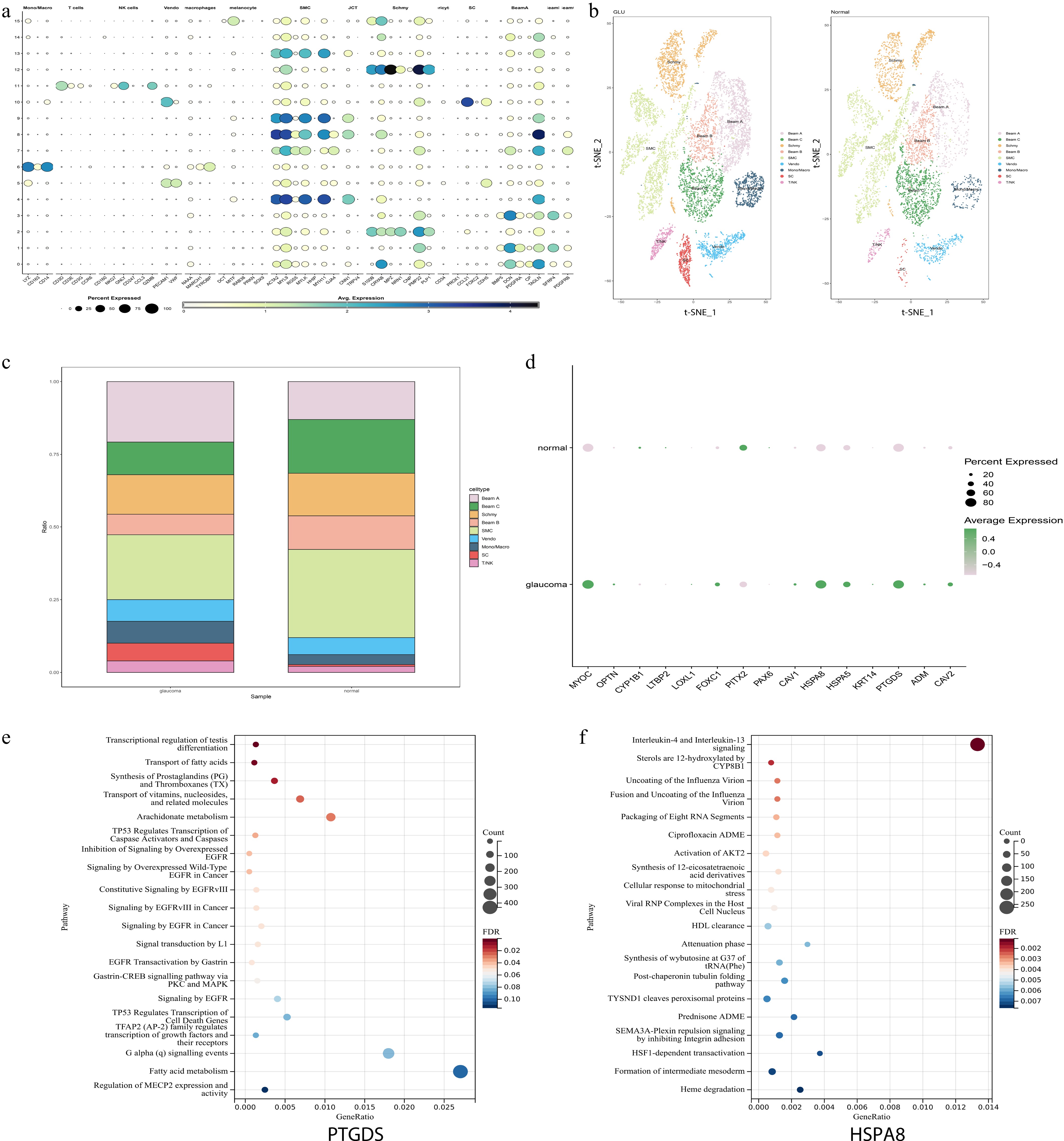 scRNA-seq identifies key genes related to SH in POAG. (a) The dot plot shows the expression levels of marker genes across each cell types in scRNA-seq analysis. (b) t-SNE visualization of the nine major cell types identified from POAG and normal samples, with clusters color-coded according to their associated cell types. (c) Proportions of different cell types in POAG and normal samples. (d) Dot plot illustrates the expression levels of SH-related genes in both the POAG group and the normal control group. The expressions of the HSPA8 and PTGDS genes were significantly increased in the POAG group. (e), (f) The GSEA enrichment analysis results of PTGDS and HSPA8 are presented. The x-axis represents the gene ratio (proportion of genes in a pathway that are differentially expressed), the y-axis lists the pathways, the bubble size corresponds to the count of genes in the pathway, and the color gradient indicates the false discovery rate (FDR) value (red for lower FDR, blue for higher FDR).