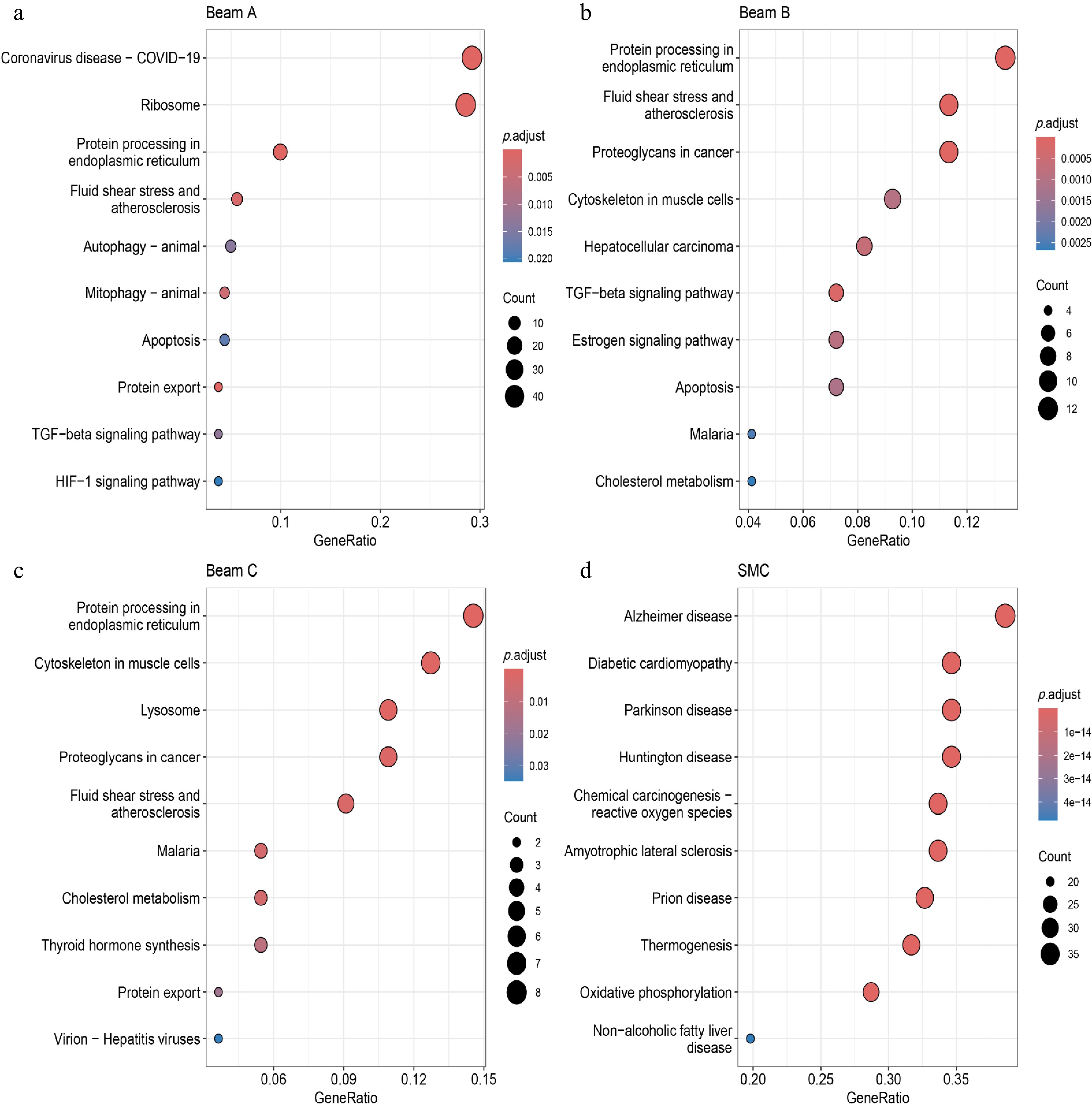 KEGG enrichment analysis of Beams and SMC clusters in POAG scRNA-seq data. (a)−(d) KEGG enrichment analysis of DEGs in Beams and SMC clusters derived from POAG scRNA-seq data. The x-axis denotes the GeneRatio (proportion of genes in a pathway that are differentially expressed), the y-axis lists the pathways. Bubble size corresponds to the count of genes in the pathway, and the color gradient represents the adjusted p-value (p.adjust), with red indicating lower adjusted p-values, and blue indicating higher adjusted p-values.