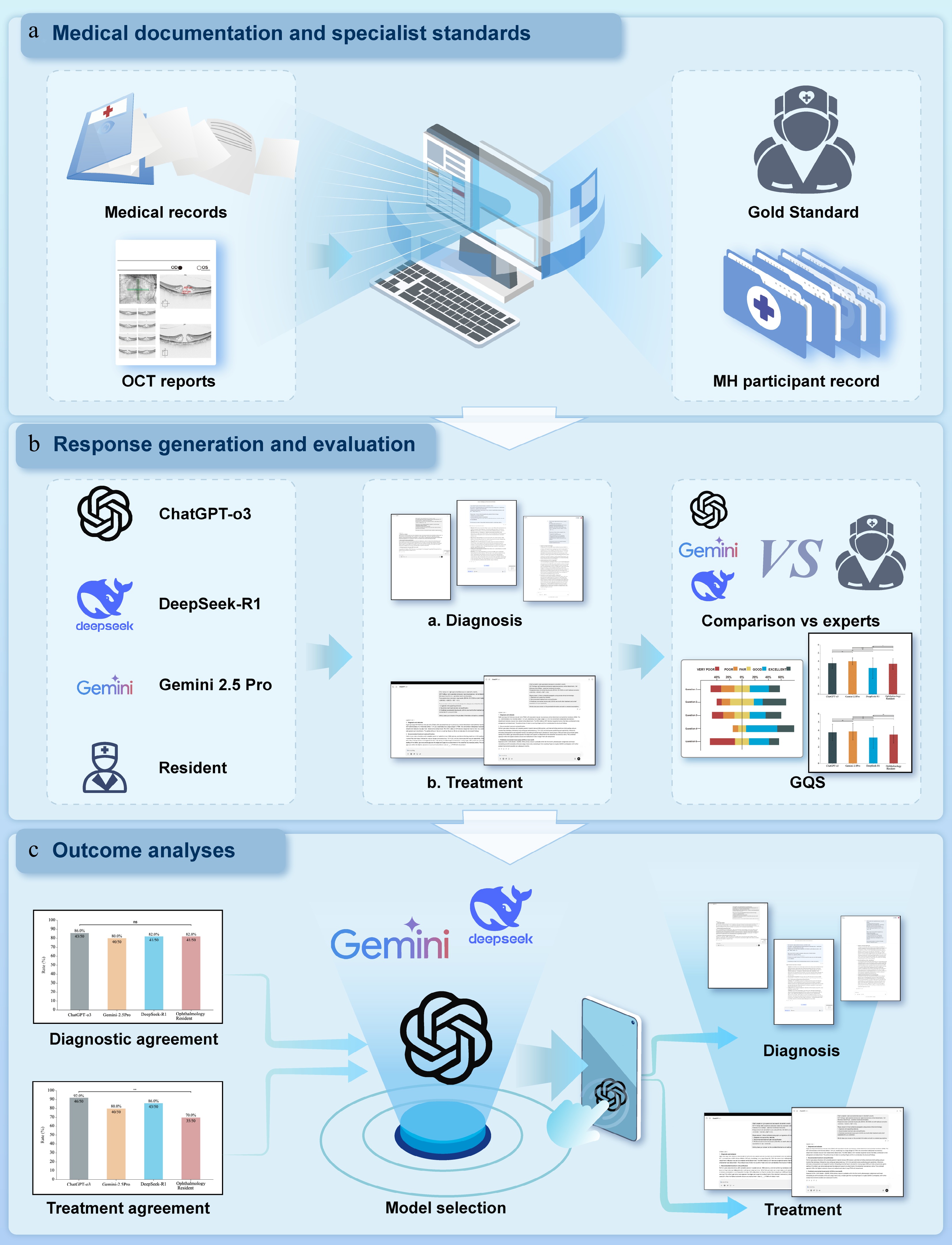 Study design and workflow. The workflow comprised three steps: (a) Medical documentation and specialist standards used to construct the MH participant record and define the gold standard, (b) response generation and evaluation by three AI chatbots and an ophthalmology resident, and (c) outcome analyses, including diagnostic agreement, treatment suggestion agreement, and GQS. Abbreviations: MH, macular hole; OCT, optical coherence tomography; GQS, Global Quality Score.
