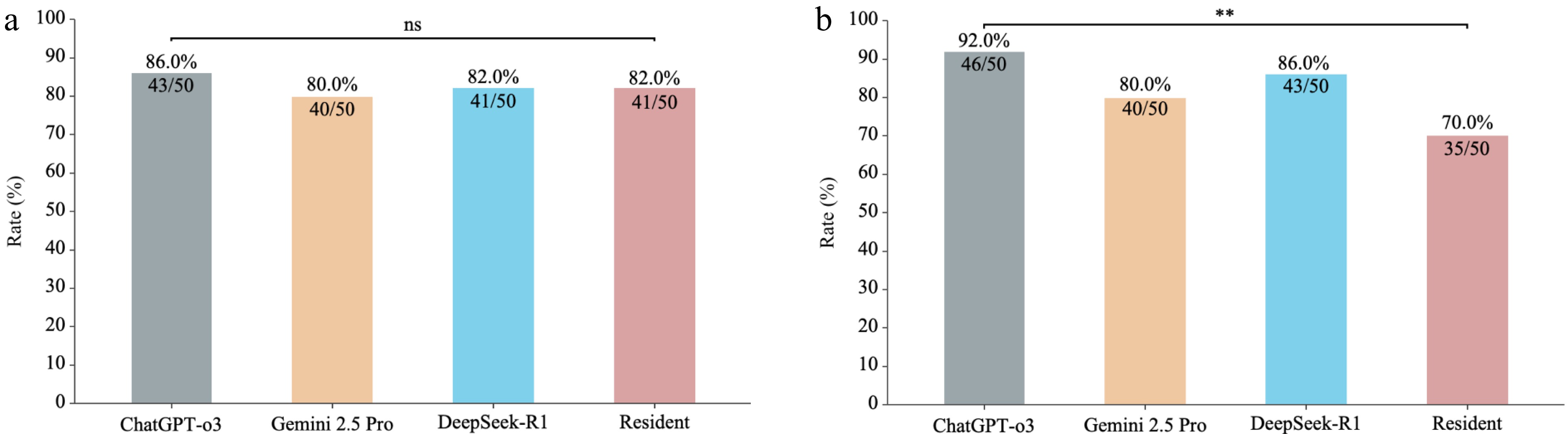 • Agreement rates were 46/50 (92%; 80.8–97.8) for ChatGPT-o3, 43/50 (86%; 73.3–94.2) for DeepSeek-R1, 40/50 (80%; 66.3–89.9) for Gemini 2.5 Pro, and 35/50 (70%; 55.4–82.1) for the resident. In comparison with ChatGPT-o3, differences were not significant for DeepSeek-R1 (p = 0.248) or Gemini 2.5 Pro (p = 0.077), whereas the residents' agreement was significantly lower (p = 0.006). Fig. 2b shows the comparison of treatment suggestion agreement.