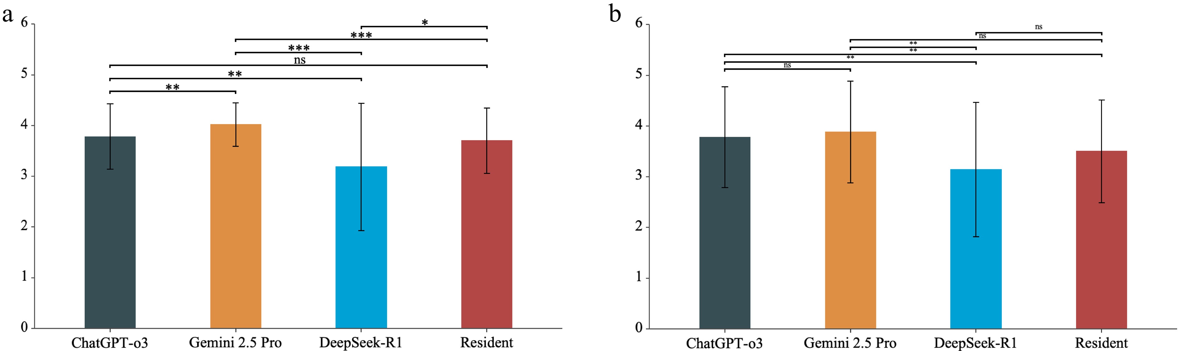 Pairwise comparisons from a GEE model showed the following. For grader 1, Gemini 2.5 Pro was higher than ChatGPT-o3 by 0.24 points (p = 0.007) and higher than the resident by 0.32 points (p < 0.001). Both Gemini 2.5 Pro and ChatGPT-o3 were higher than DeepSeek-R1 (0.84, p < 0.001; 0.60, p = 0.003), and ChatGPT-o3 and the resident did not differ (p = 0.151). For grader 2, ChatGPT-o3 was higher than DeepSeek-R1 by 0.64 points (p = 0.006) and higher than the resident by 0.28 points (p = 0.007), and Gemini 2.5 Pro was higher than DeepSeek-R1 by 0.74 points (p = 0.003). Gemini 2.5 Pro did not differ from ChatGPT-o3 (p = 0.587) and was 0.38 points above the resident (p = 0.051). Across graders, DeepSeek-R1 scored consistently lower, whereas Gemini 2.5 Pro and ChatGPT-o3 had similar scores, and their rank varied by grader (Fig. 3a, b).