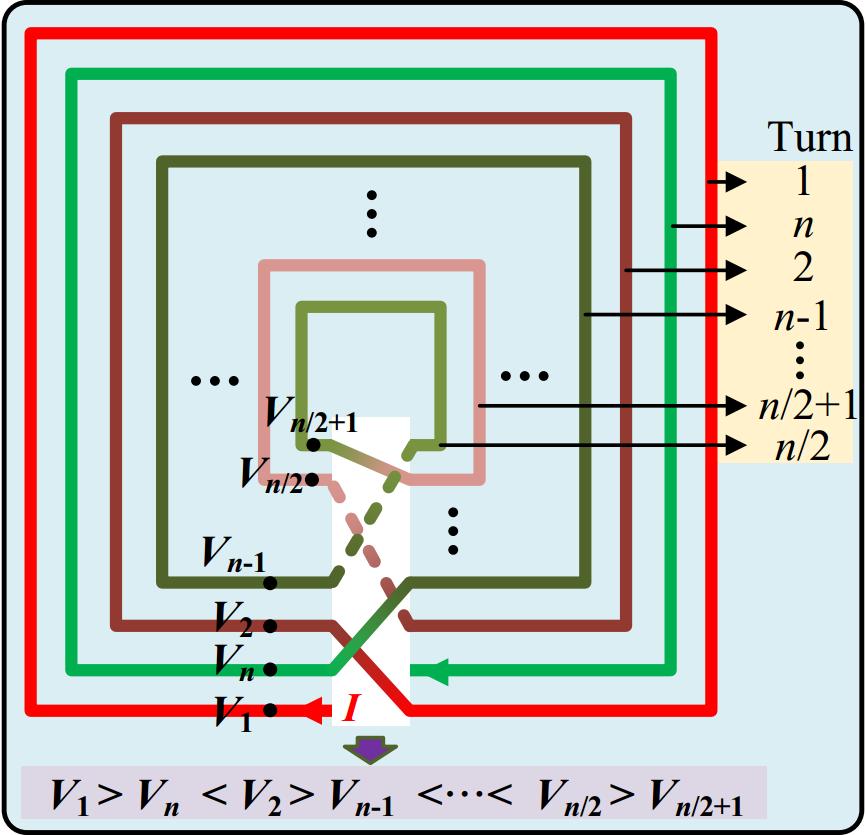 As shown in Fig. 1, the ITAP method employs an interleaved winding coil configuration while maintaining the original winding direction. The physical turn sequence is rearranged from outer to inner layers as 1, n, 2, n-1, ..., n/2 + 1, n/2. With the input voltage Vin_coil (where Vin_coil = V1) applied, the node voltage at each turn starting point is denoted as Vi (i = 1, 2, ..., n). Unlike the conventional monotonically decreasing voltage distribution (V1 > V2 > ··· > Vn), the ITAP structure generates an oscillatory voltage profile (V1 > Vn < V2 > Vn-1 < ··· < Vn/2 > Vn/2 + 1). This alternating arrangement of high-voltage and low-voltage turns creates localized potential cancellation effects, thereby reducing the overall electric field radiation intensity. However, variations in self-inductance and mutual inductance across the coil can result in uneven voltage distribution and localized voltage overlap, exacerbating E-field intensity. To address these challenges, the ITAP method incorporates strategic placement of compensation capacitors to balance inductive effects across the coil turns.