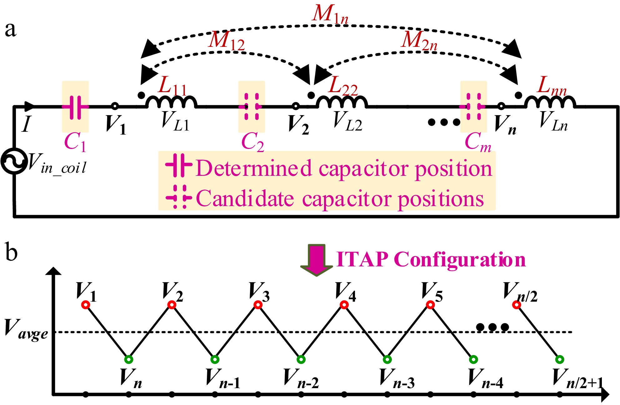Figure 2a presents the equivalent circuit diagram based on the proposed ITAP method, where Lii (i = 1, 2, ..., n) denotes the self-inductance of the i-th turn, while Mij and kij represent the mutual inductance and coupling coefficient between the i-th and j-th turns, respectively. This methodology effectively reduces the electric field leakage of the system by strategically distributing compensation capacitors across different coil turns. The fundamental configuration involves a fixed compensation capacitor C1 at the first node, which is designed based on two considerations: firstly, this node is located at the outer side of the coil structure, facilitating rapid tuning in practical engineering applications; secondly, this configuration maintains compatibility with classical S-type and LCC-type compensation topologies. The placement of compensation capacitors at remaining nodes is determined through theoretical calculations. The innovation of the ITAP method lies in its design that achieves alternating high-low voltage distribution characteristics between adjacent nodes, as illustrated in Fig. 2b.