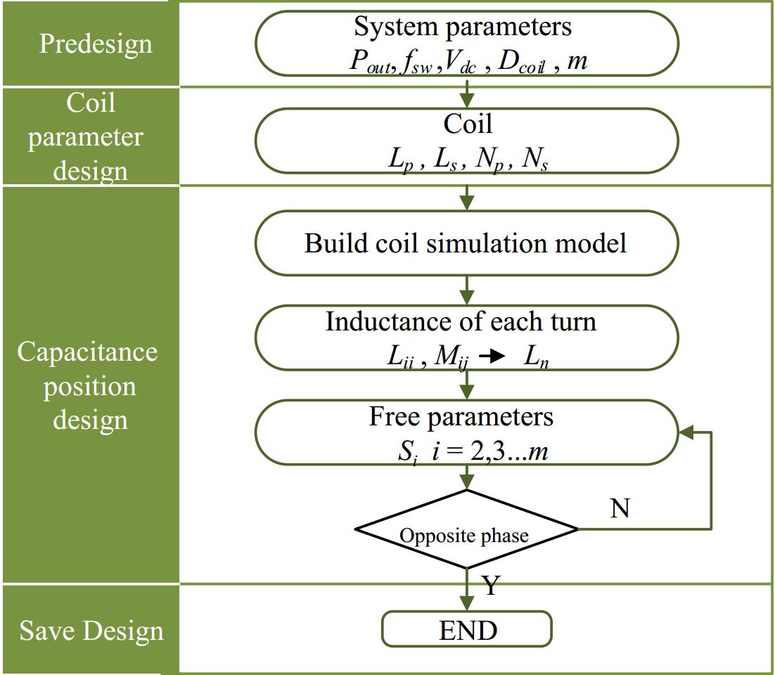 According to the above derivation process, the derivation process of compensating capacitor position can be obtained as follows in Fig. 3. First, system parameters such as output power, switching frequency, input voltage, and the number of capacitors are defined. Based on power transmission requirements, operating frequency, coupling dimensions, and compensation network topology, the coil's self-inductance and number of turns are determined. Using Ansys finite element simulation software, the self-inductance Lii and mutual inductance Mij are extracted. The equivalent inductance Li for each coil segment is then calculated. The capacitor positions are treated as free parameters and optimized iteratively to ensure opposite-phase voltages between adjacent turns for inter-turn voltage cancellation. Finally, optimization results are validated through electric field simulations and experimental testing to confirm the design's effectiveness.