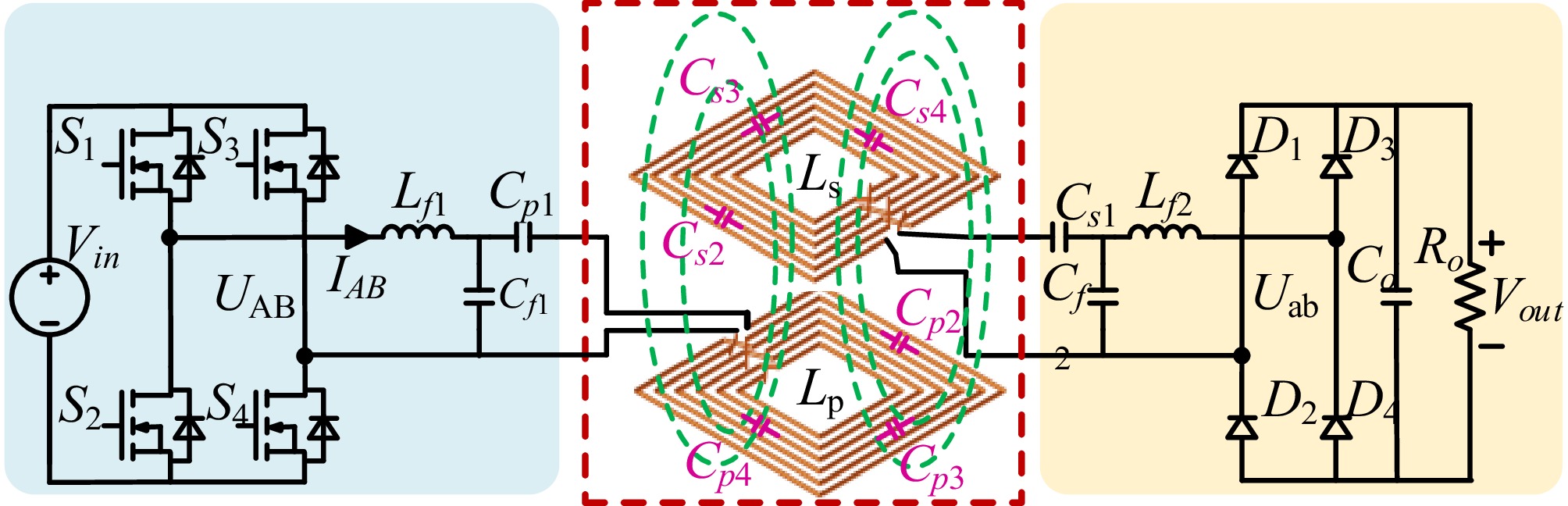 $ {P_{out}} = \dfrac{{\sqrt {{L_P}{L_S}} }}{{{\omega _0} \times {L_{f1}} \times {L_{f2}}}} \times {k_{coeff}} \times {U_{AB}} \times {U_{ab}} $ (8) where, Lp and Ls are the self-inductances of the primary and secondary coils, respectively, kcoeff is the coupling coefficient, UAB and Uab are the voltages at the inverter and rectifier bridge arms, and ω0 is the system's angular switching frequency.