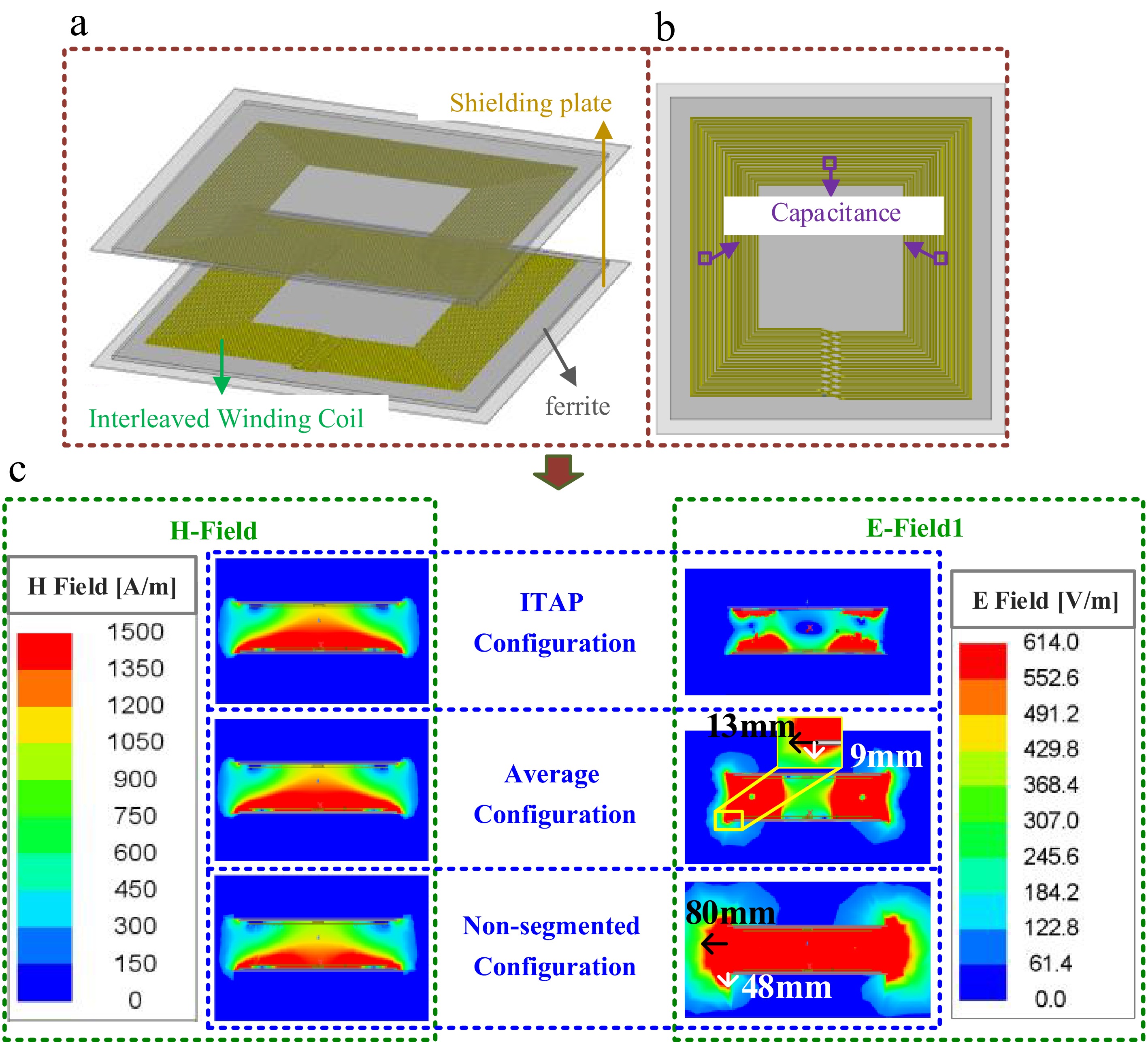 (a) 3D simulation model of ITAP coil structure. (b) Top view of the transmitting coil and the position of the compensation capacitor. (c) Magnetic and electric field distribution.