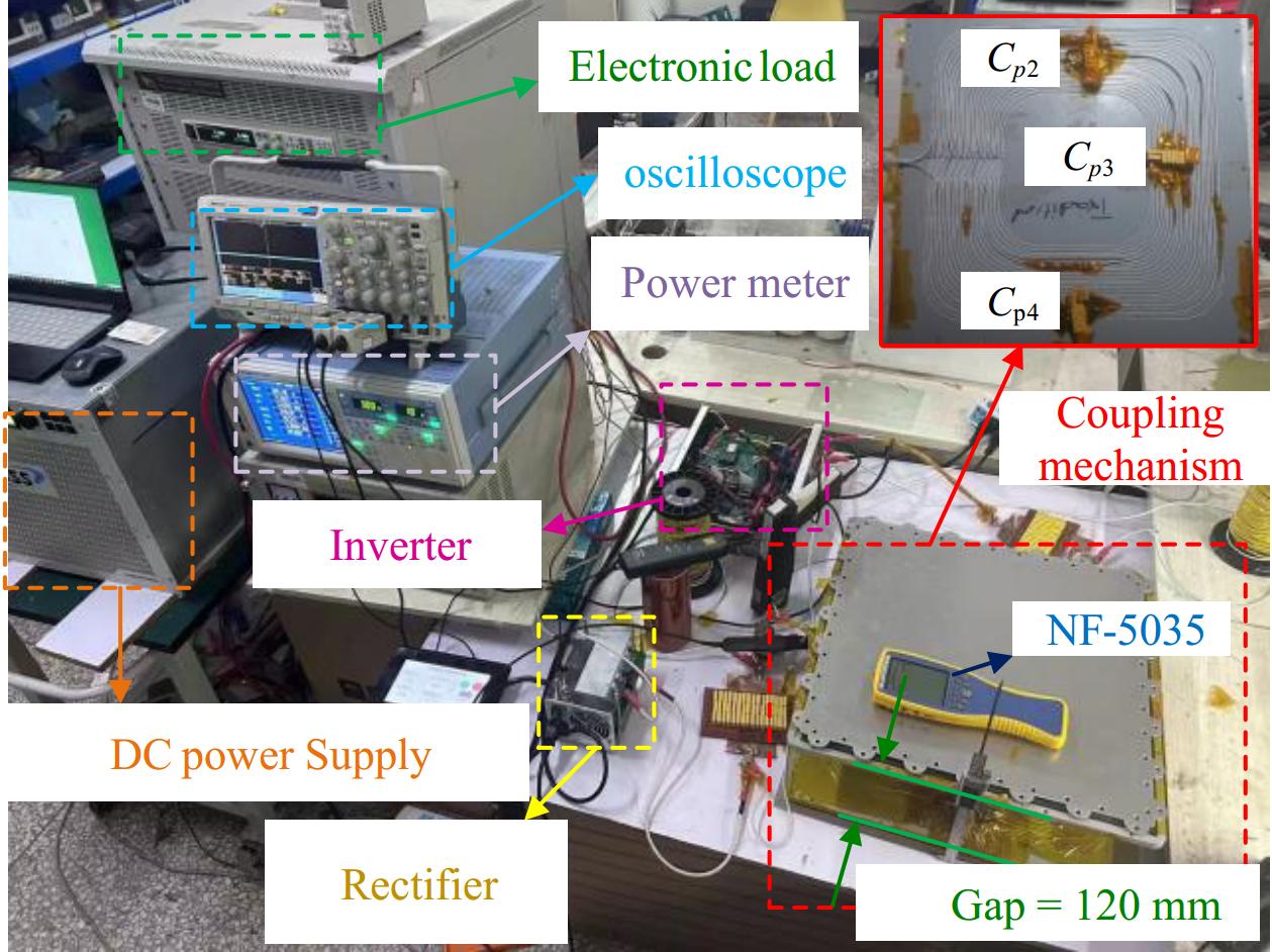 To validate the advantages of the proposed ITAP method in reducing electric field exposure, a 3.3 kW prototype was constructed. The experimental setup is shown in Fig. 6, where the coil structure with an ITAP configuration and the compensating capacitor are located in the upper right corner of the figure. The positions of the three thin-film compensating capacitors in the diagram correspond to those of the capacitors in Fig. 5b. The inverter employs Infineon's IMZ120R030M SiC MOSFET (1,200 V/30 mΩ) as the switching transistor.