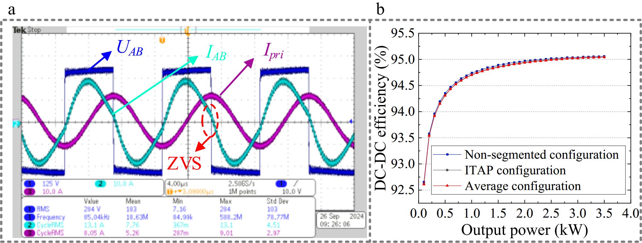 Figure 7a shows the current and voltage waveforms of the system during operation measured by the MDO3024 oscilloscope, where Ipri is the current of the transmitting coil. Since the waveforms of the three compensation configurations are nearly identical, only the experimental waveform for the ITAP configuration is presented. It can be observed that the system successfully achieves zero-voltage switching (ZVS). Figure 7b presents the DC-DC efficiency curves for the three configurations at different output power levels measured by the WT1800 power analyzer. It can be observed that the proposed ITAP method does not affect the system's transmission efficiency, further validating the accuracy of the simulation results.