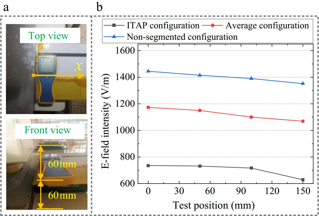 Electric field intensity measurements for the three configurations (ITAP, non-segmented configuration, and average configuration) were conducted using an NF-5035 tester. The measurements were initiated at the mid-height position of the outer edge of the coupling mechanism and performed point-by-point, moving outward in 5 cm increments, as illustrated in Fig. 8a. The test results are presented in Fig. 8b. The data reveal that the electric field intensity of the ITAP configuration is only 50.93% of the non-segmented configuration and 62.73% of the average configuration. These results demonstrate that the ITAP configuration significantly reduces electric field exposure levels.