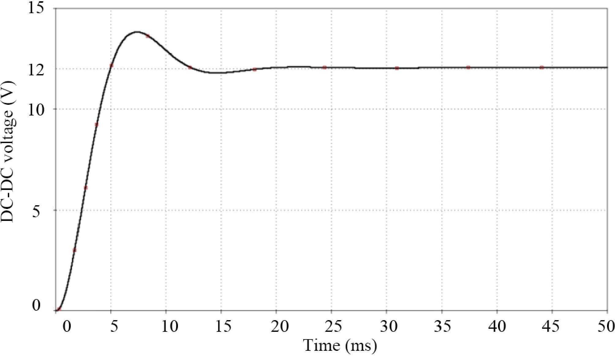 The waveform indicates that the voltage rises rapidly at the initial stage, reaching a peak of around 15 V at approximately 5 ms. The voltage then drops rapidly and, after a few minor oscillations, stabilizes around 12 V. From 14 ms onward, the voltage remains stable at about 12 V, with minimal fluctuation, demonstrating the system's ability to quickly adjust and maintain a stable output voltage. This simulation result verifies the effectiveness and fast response characteristics of the DC-DC converter in voltage regulation, ensuring stable voltage output under different load conditions.